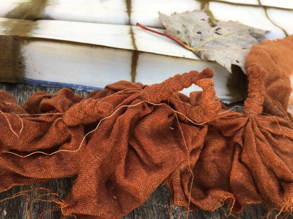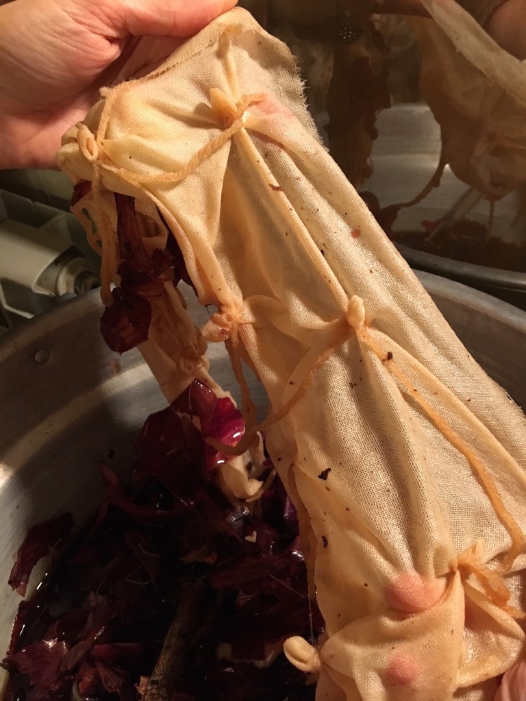 Ed ecco la seconda domanda: ‘Cosa possiamo usare come bagno di colore?’. Ci pensiamo un attimo. Ci sono varie possibilità: antichi strumenti di ferro arrugginiti, le foglie delle roverelle che si trovano nelle vicinanze oppure le cipolle di Rosella, se la produzione è stata abbondante.