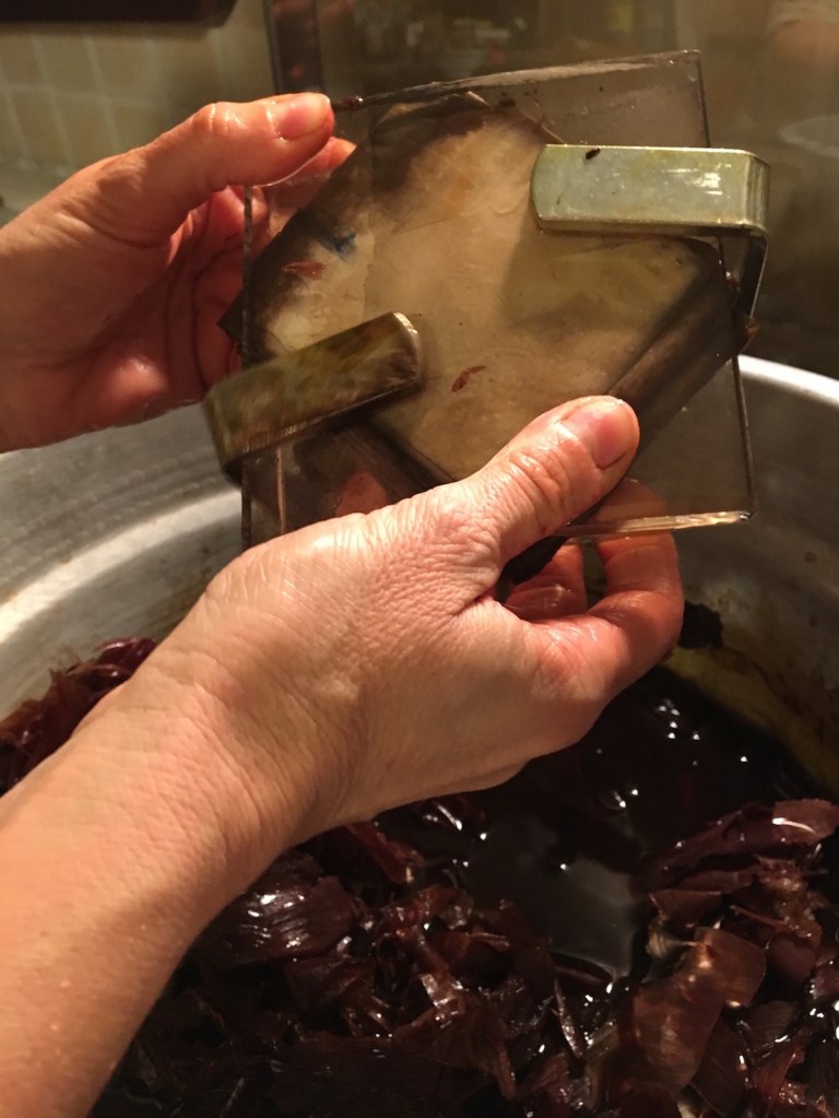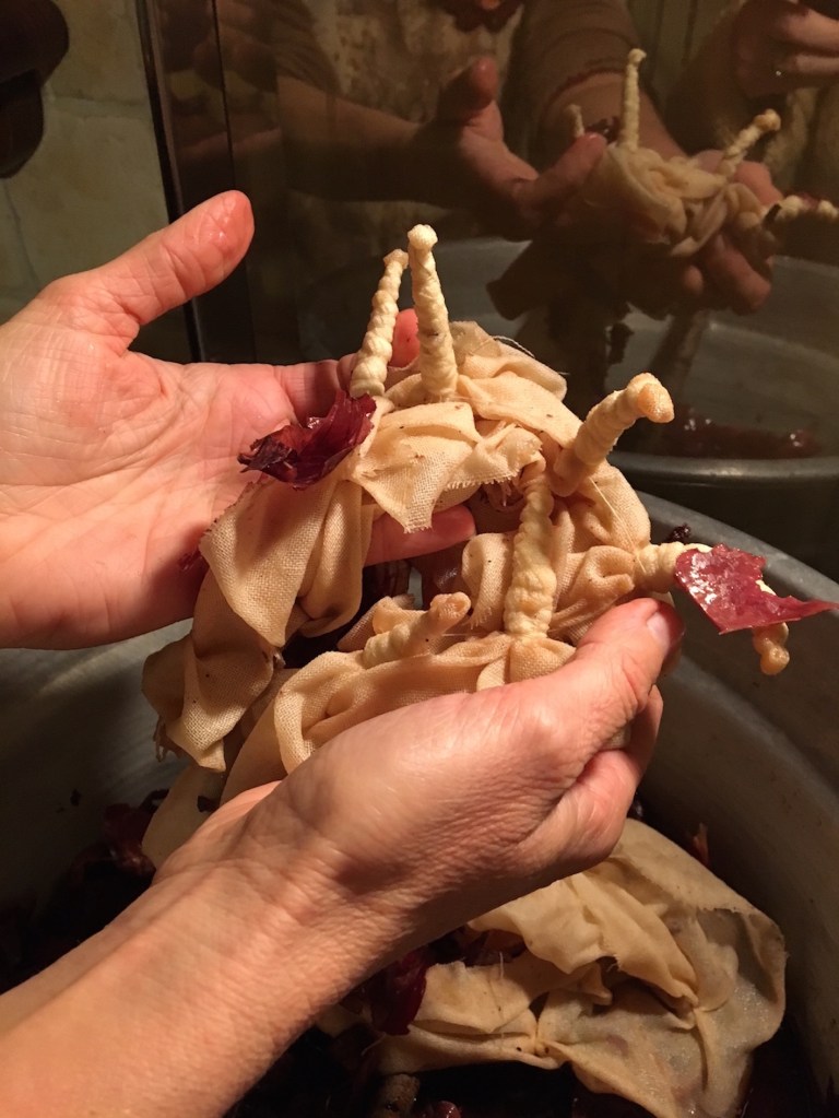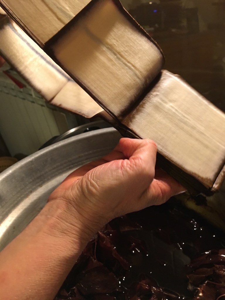 Sono state due giornate intense, tra preparativi, cottura e apertura dei tessuti. Ho collaborato in prima persona, ho preso appunti e scattato fotografie per riuscire in un secondo momento a descriverle. All’apertura dei tessuti abbiamo coinvolto anche Rosella. Il bagno di colore che hanno lasciato è stato fondamentale per i risultati!