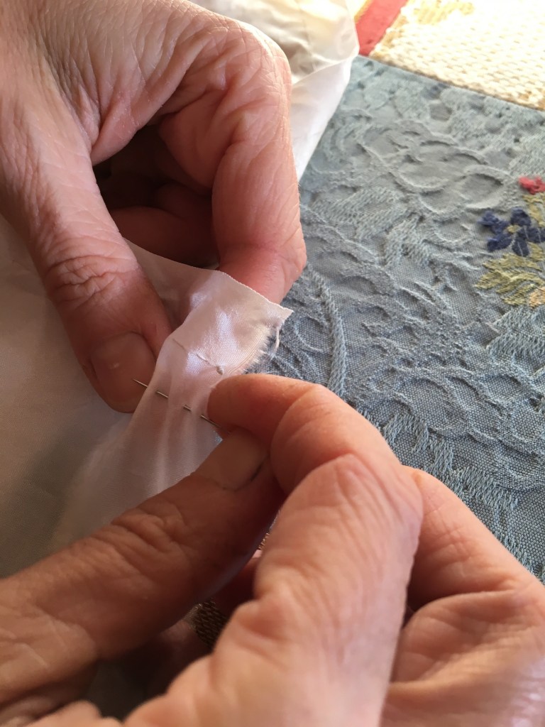 Nella tecnica mokume entrano in gioco ago e filo che, in una paziente composizione di filze, possono creare effetti splendidi, primo fra tutti il cosiddetto effetto corteccia – mokume, appunto. Le filze devono essere parallele ma con punti sfalsati che partono tutte dallo stesso lato del tessuto. Da una parte si avranno quindi tutti i nodi e dall’altra i fili lasciati un po’ lunghi. Con le filze sono numerosissimi gli effetti decorativi che si possono ottenere e come sempre… più preciso e fine è il lavoro, migliore sarà il risultato!