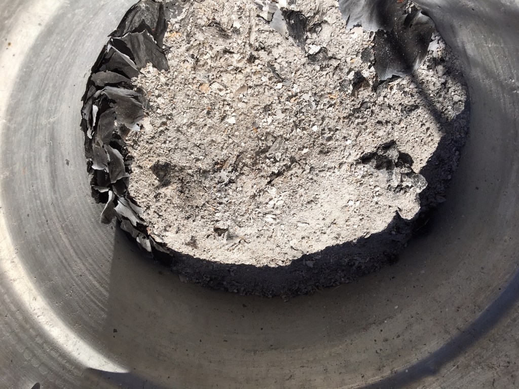 La svuotiamo del contenuto – preziosa cenere che servirà per future sperimentazioni – verifichiamo che non sia bucata. E’ pronta per essere riempita con la materia tintoria.