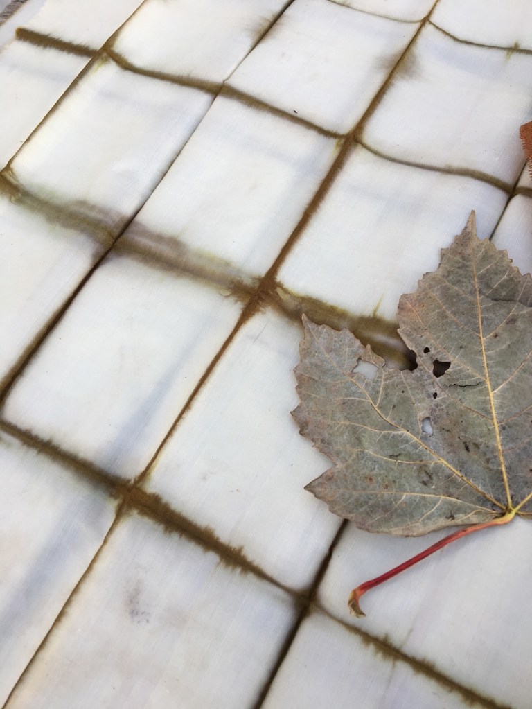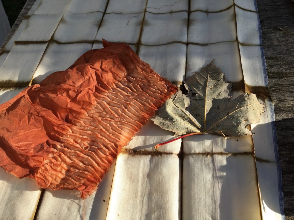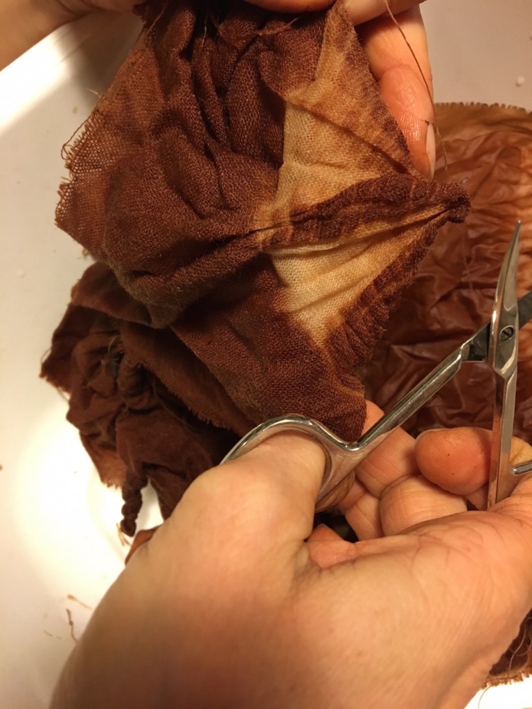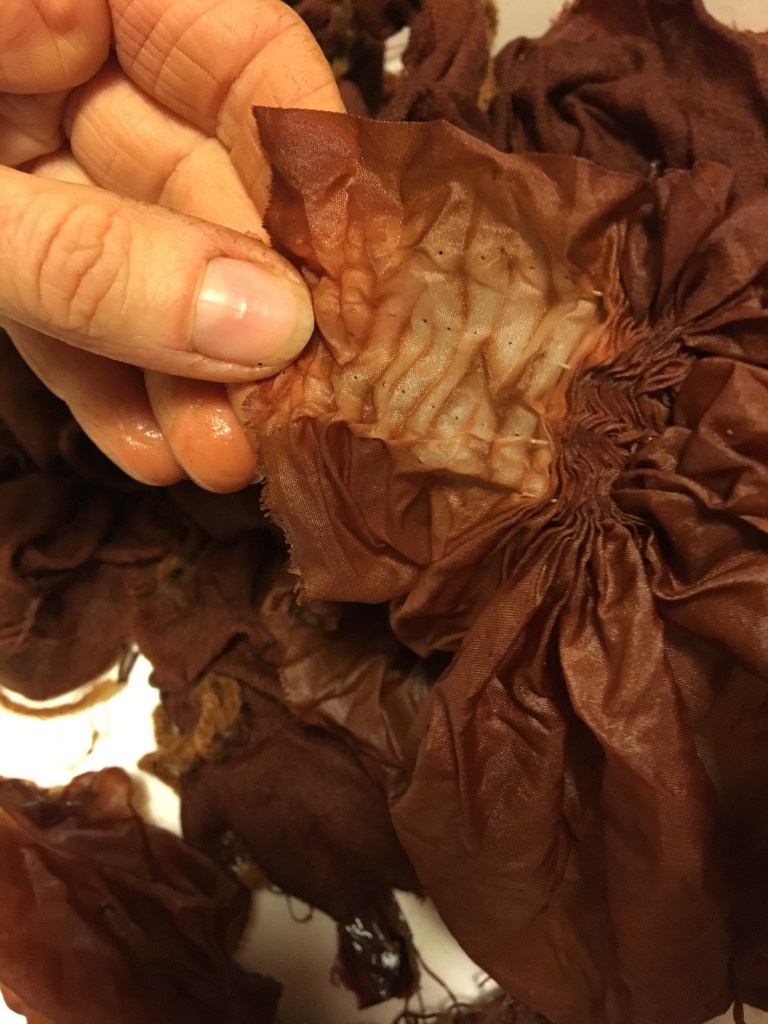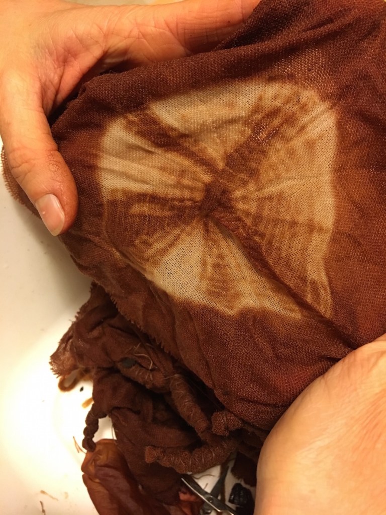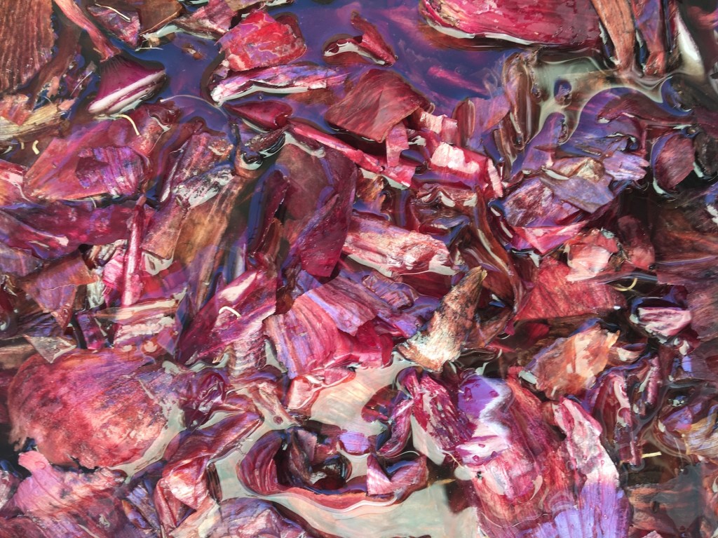 Optiamo per verificare la terza possibilità. Raggiungiamo Rosella e la sua dispensa dove bellissime cipolle rosse riempiono alcune cassette. Con un po’ di attenzione, per non rovinare nulla, le ripuliamo delle tuniche esterne che raccogliamo in un contenitore. Ce ne torniamo a casa con il nostro bottino per procedere con il piano di Michela: sperimentare alcune tecniche shibori su tessuti diversi per preparare il corso programmato per il fine settimana.