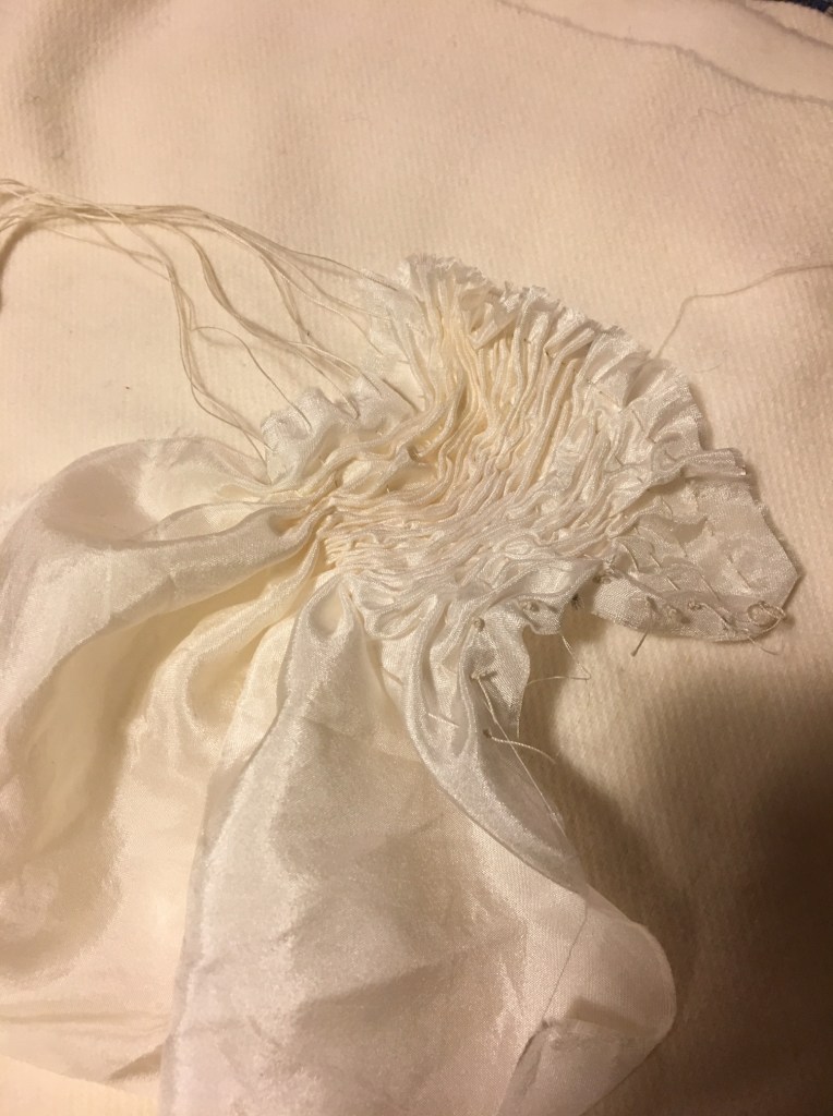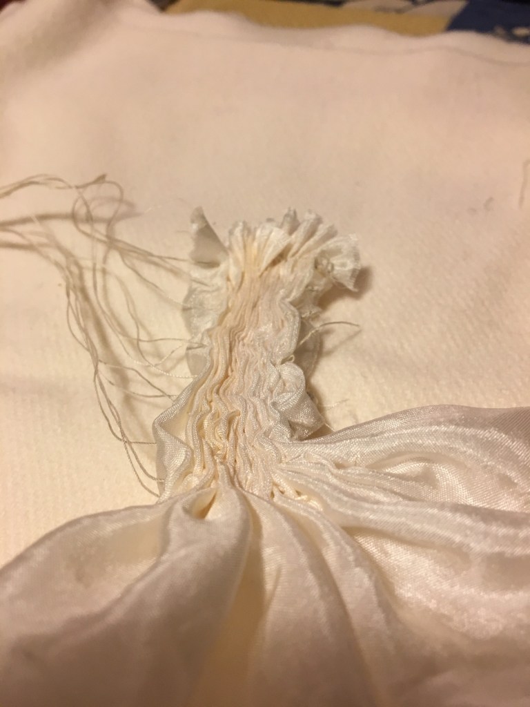 Kumo: è una tecnica che fa parte del sottogruppo delle legature: per realizzarla si “pinza” una porzione di tessuto più o meno grande e si crea un cappio con il filo da passare più volte alla base dello stesso. il segreto è tirare molto bene il filo affinché esso crei una riserva nitida.