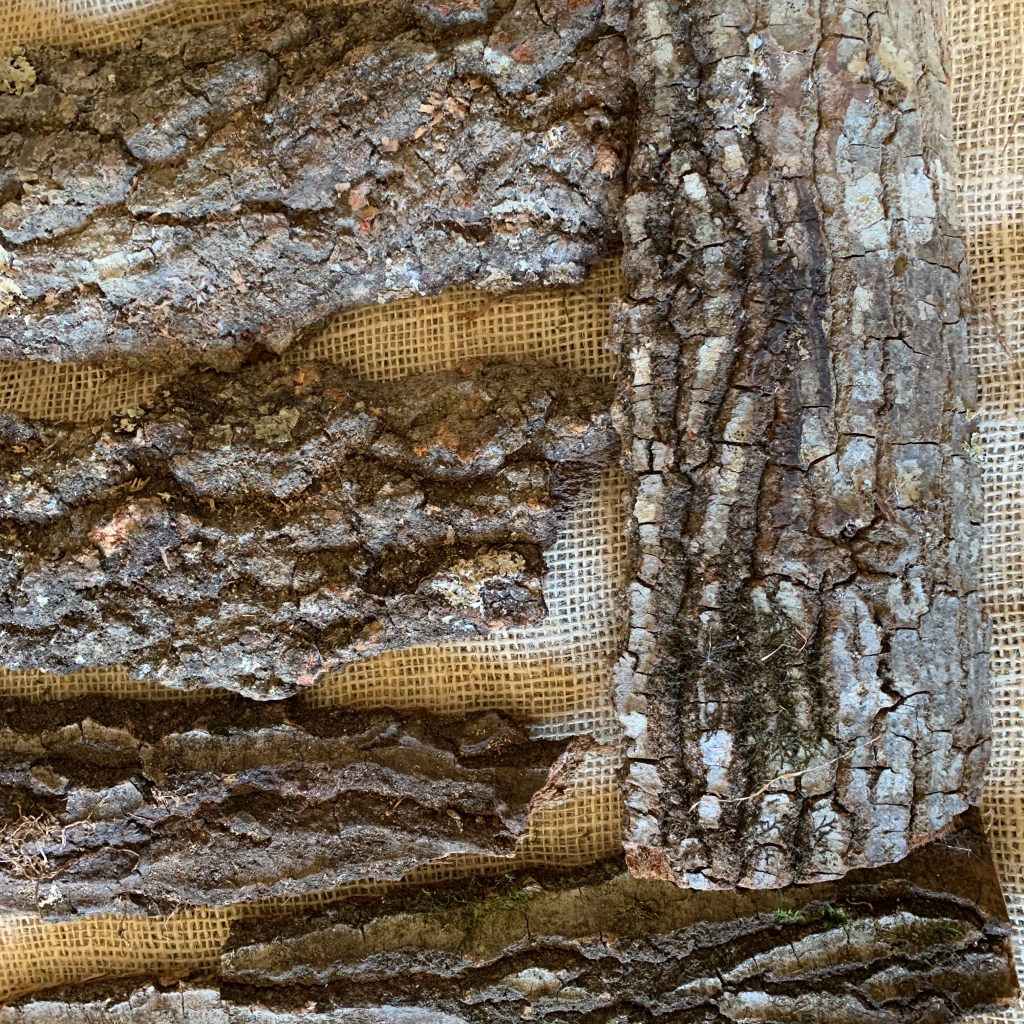 Durante il mesi di gennaio appena trascorso – decisamente mite, troppo!, e secco – ho preparato il bagno lasciando a mollo le cortecce per alcuni giorni e, infine, portandole a ebollizione per circa un’ora. Una volta raffreddato, ho immerso nel bagno alcuni campioni di tessuto precedentemente mordenzati (un ritaglio di tessuto a telaio in canapa e uno di leggero tessuto di cotone).