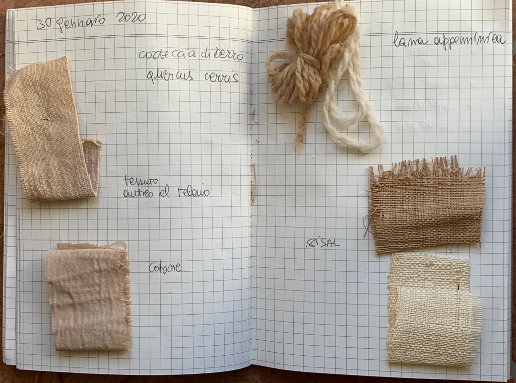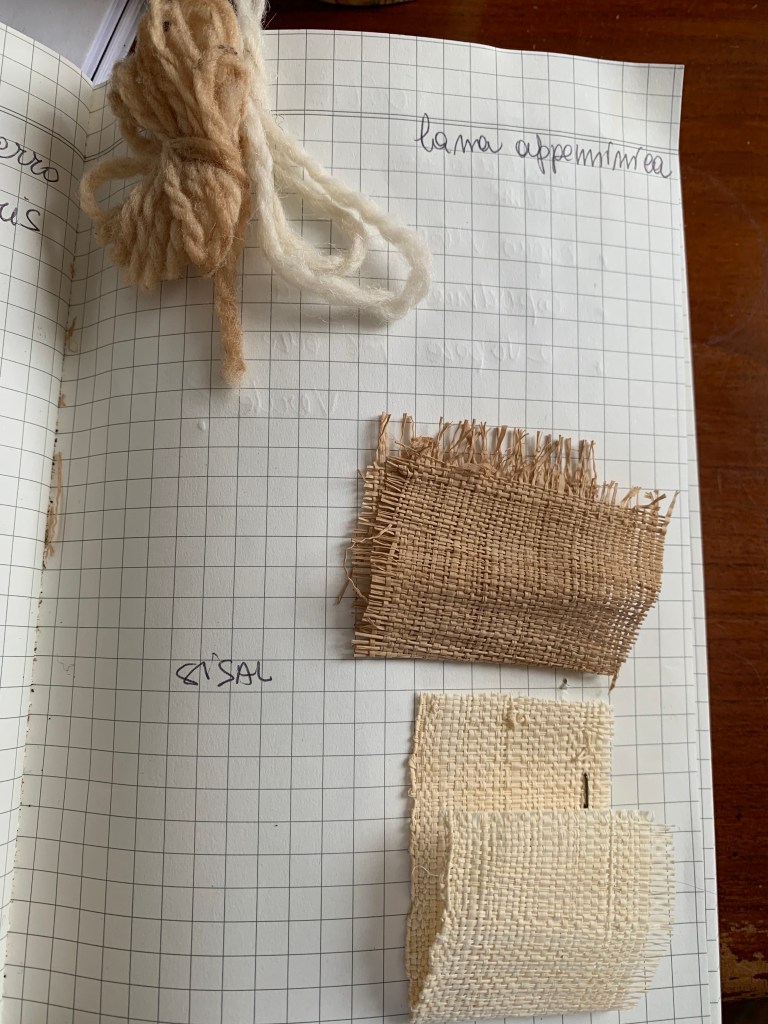 Successivamente, nello stesso bagno, ho immerso una matassa di lana appenninica di Lana Viva. Infine, un ritaglio di sisal, un altro proveniente da un vecchio sacco in juta e alcuni campioni realizzati con un filato di juta acquistato da Campolmi (storico negozio di Firenze).