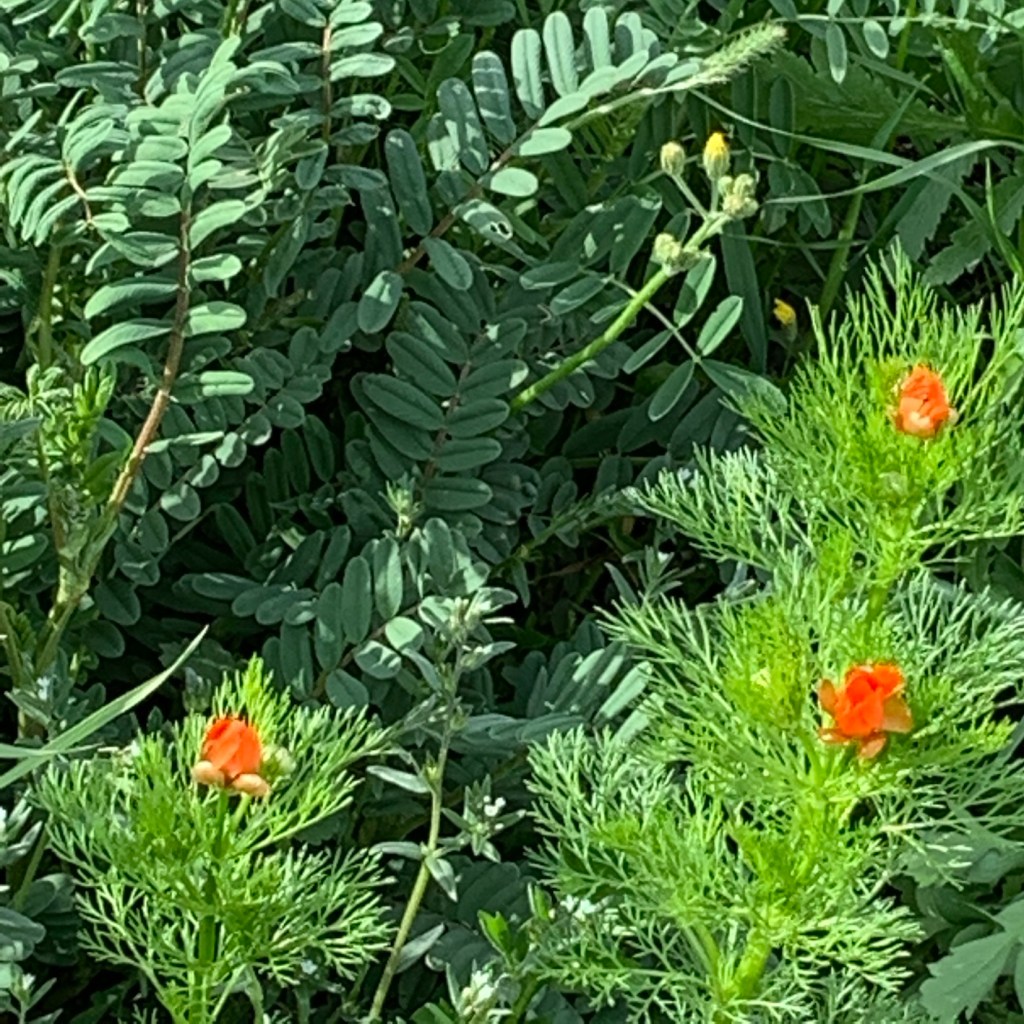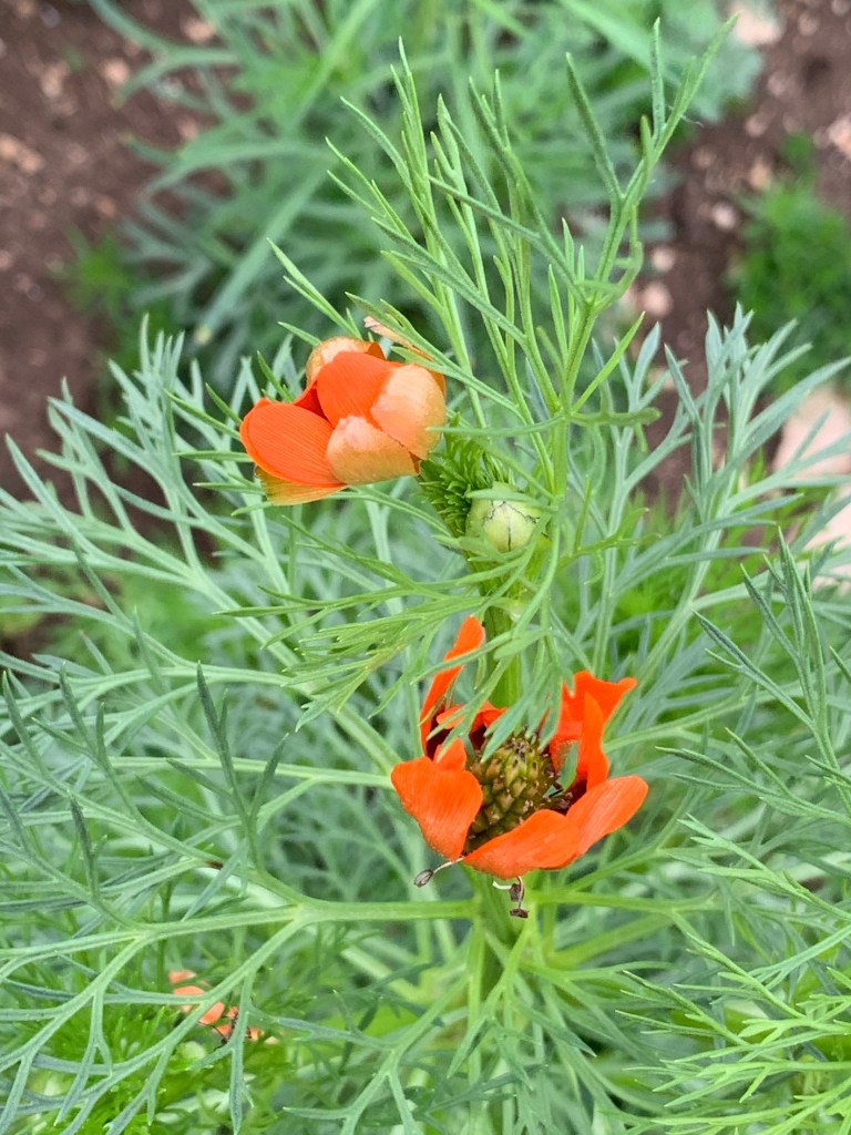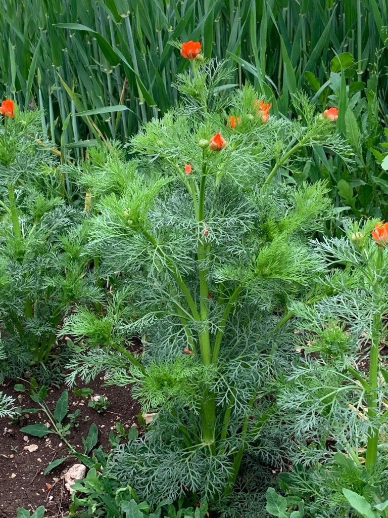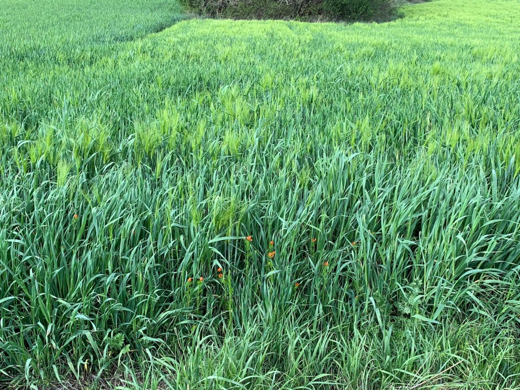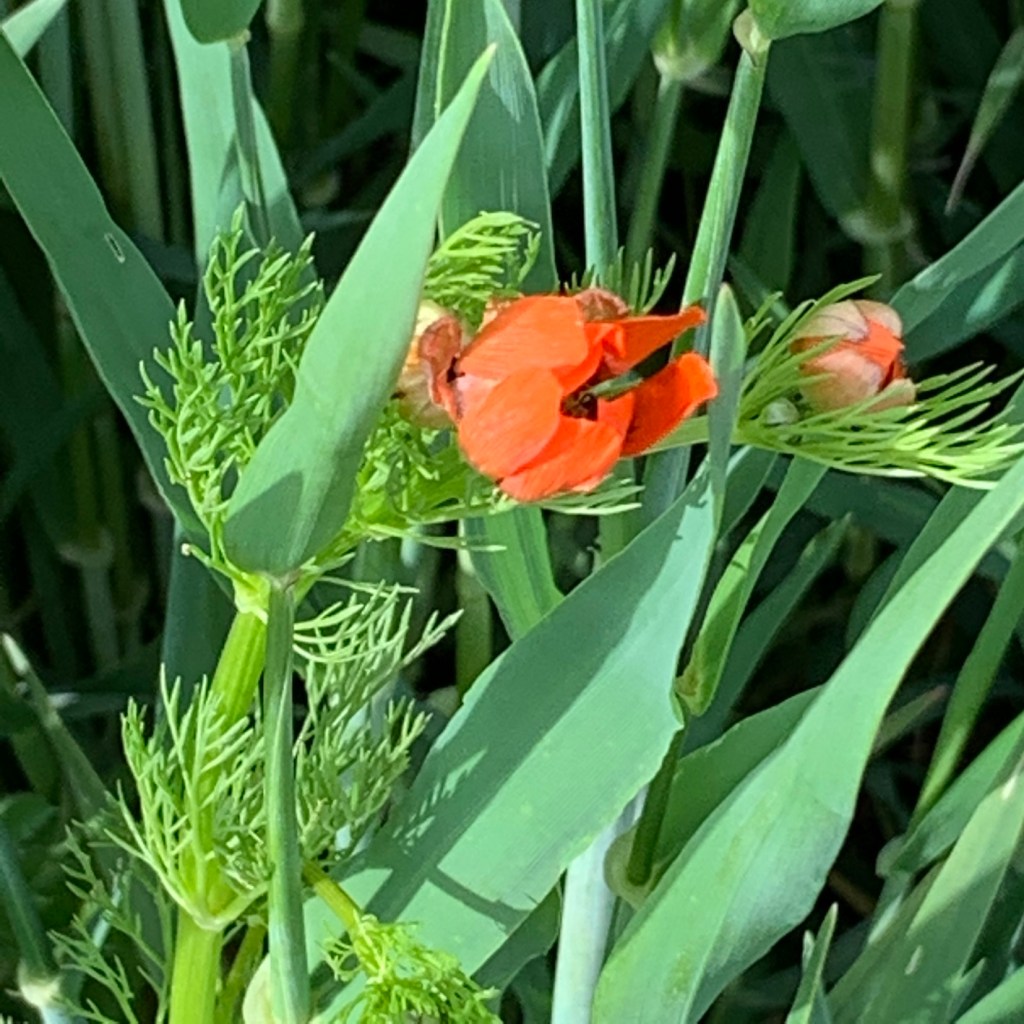 Lungo i campi coltivati a cereali e leguminose (qua e là fanno già capolino i fiori della veccia), si affacciano numerosi i capolini rossi dell’Adonide rossa (Adonis aestivalis).