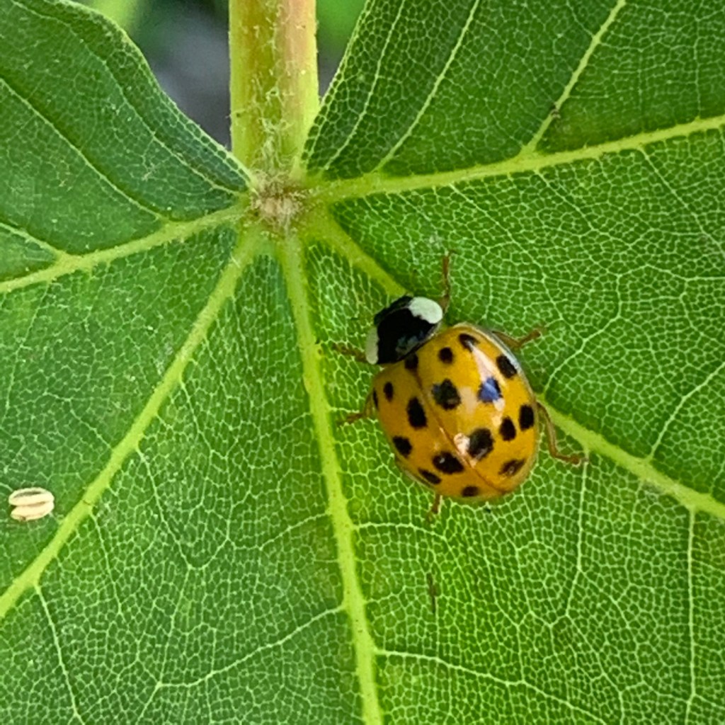 E, credo, l’acero montano (Acer pseudoplatanus). Su una foglia del quale, scopro un intruso: una coccinella arlecchino, ossia un piccolo coleottero di provenienza asiatica (e siamo qui a impazzire sul come arrivino i virus, quelli si veramente minuscoli! e non riconosciamo, spesso, gli insetti più grandi!)