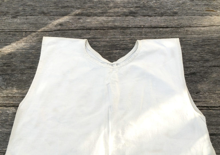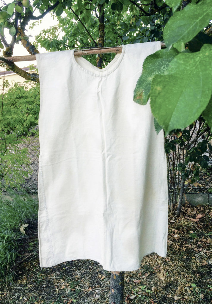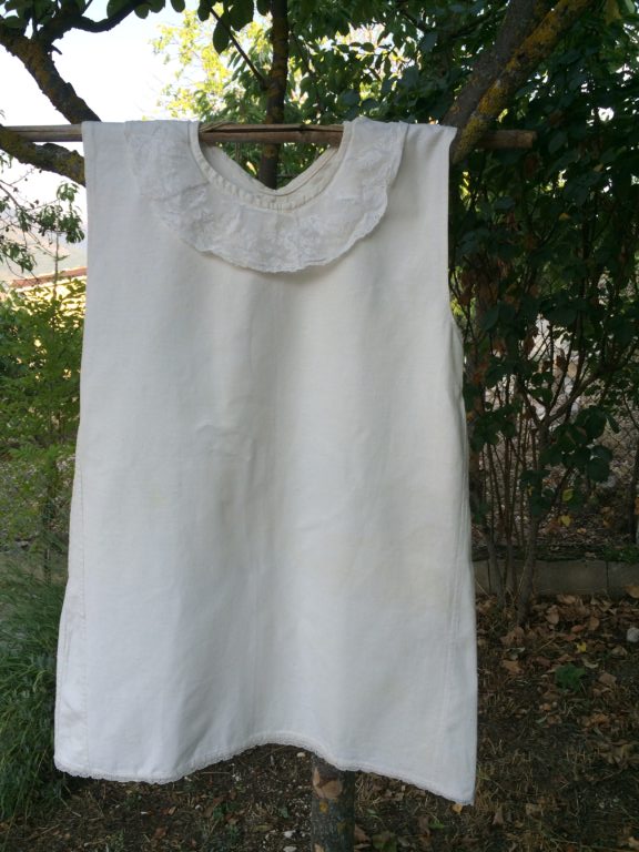Il tessuto è lo stesso delle lenzuola, il taglio molto semplice, ingenuo, chiaramente frutto di una mano non molto esperta di taglio e cucito che comunque ha realizzato con le proprie mani un capo di cui aveva bisogno.