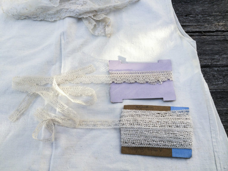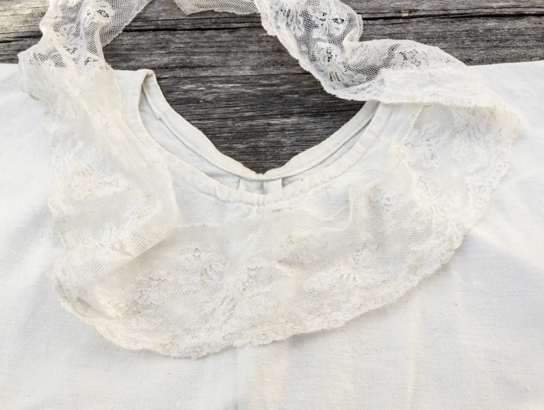 Sicuramente serve un merletto attorno allo scollo e uno al bordo: sì, credo proprio di averli individuati. Quello più alto ha qualche macchia dovuta al tempo, perfettamente in linea con la condizione del tessuto della camicia.