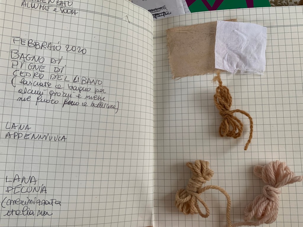 - Non ho trovato indicazioni specifiche sull’uso delle pigne di cedro nei libri che ho a disposizione (D. Cardon, Le monde des teintures Naturelles; Anne Varichon, Couleurs; Jenny Dean, Wild Color e Paola Della Pergola, Colori secondo natura). Quindi procedo liberamente, senza seguire regole. In modo scriteriato, appunto. Il fine dei miei esperimenti è capire, imparare, approfondire (a partire dal mondo che mi circonda). I tessuti e le lane che tingo non restano mai inutilizzati: diventano i protagonisti, rispettivamente, di altri esperimenti (di cucito e di maglia).
