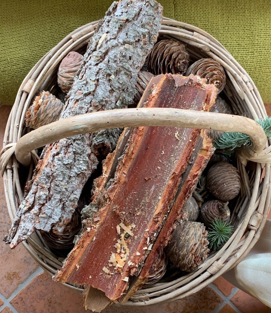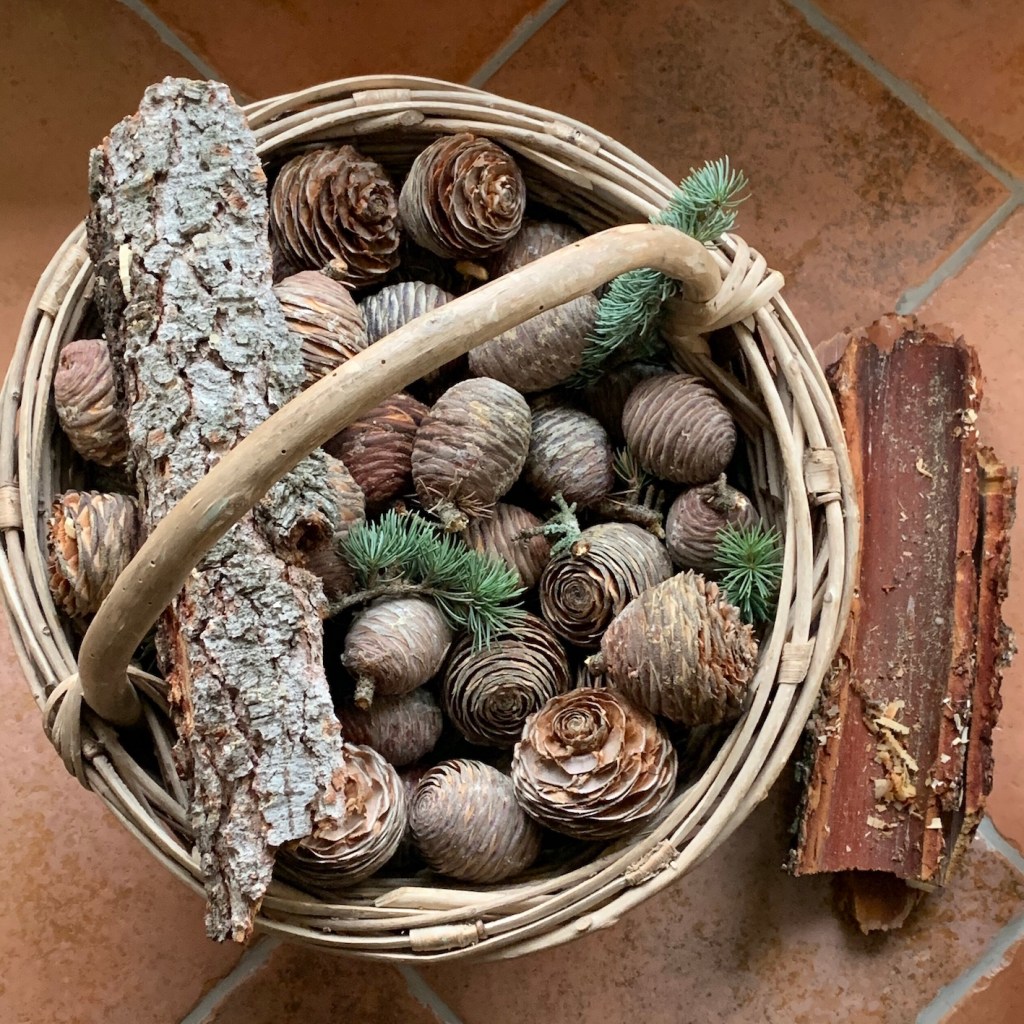 Nei giorni successivi, durante le consuete camminate con Rosella, lo strato di pigne ormai a terra è evidente. Sono lì ormai sterili, secche. Alla successiva camminata, porto con me un cesto e ne faccio un bel raccolto. La destinazione naturale è quella di essere d’aiuto per accendere il caminetto! Forse potrebbero essere utilizzate anche per tingere. Non ho alcuna certezza ma decido di fare un tentativo.