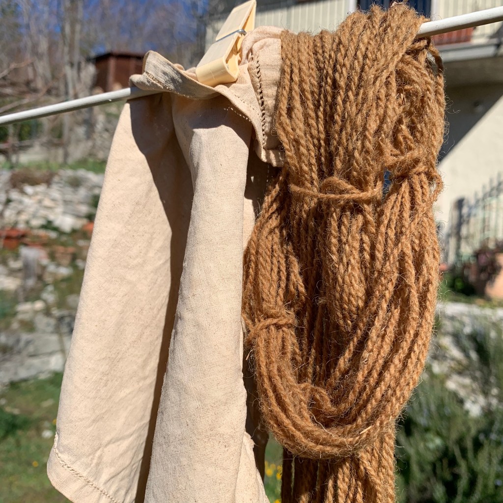 A questo punto metto a bagno una striscia di cotone (già mordenzata con allume e Soda Solvay) e un campione di lana appenninica e ripeto la sequenza (lascio a mollo per un paio di giorni, metto sul fuoco fino quasi a bollore, lascio raffreddare). Ripeto l’operazione con due matasse di lana ‘merinizzata’ italiana proveniente dagli allevamenti di Campo Imperatore a suo tempo tinti da Michela in due bagni successivi, molto leggeri, di campeggio e rosso di robbia. Tanto per vedere ‘l’effetto che fa’. Infine ho recuperato le pigne dal bagno colore e le ho lasciate seccare al sole. Ora sono pronte per la loro ‘prima’ destinazione, il caminetto!