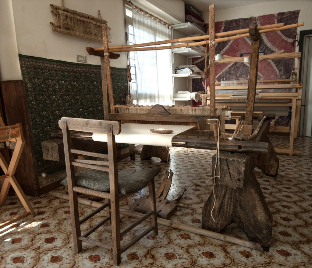 Il punto focale del laboratorio studio di Valeria Belli, a Brecciarola (Chieti), è un antico telaio abruzzese, imponente e stabile, proveniente dalla zona della Maiella e avuto, agli inizi della sua attività (1999), da un restauratore di Scafa in cambio della preparazione di un ordito.