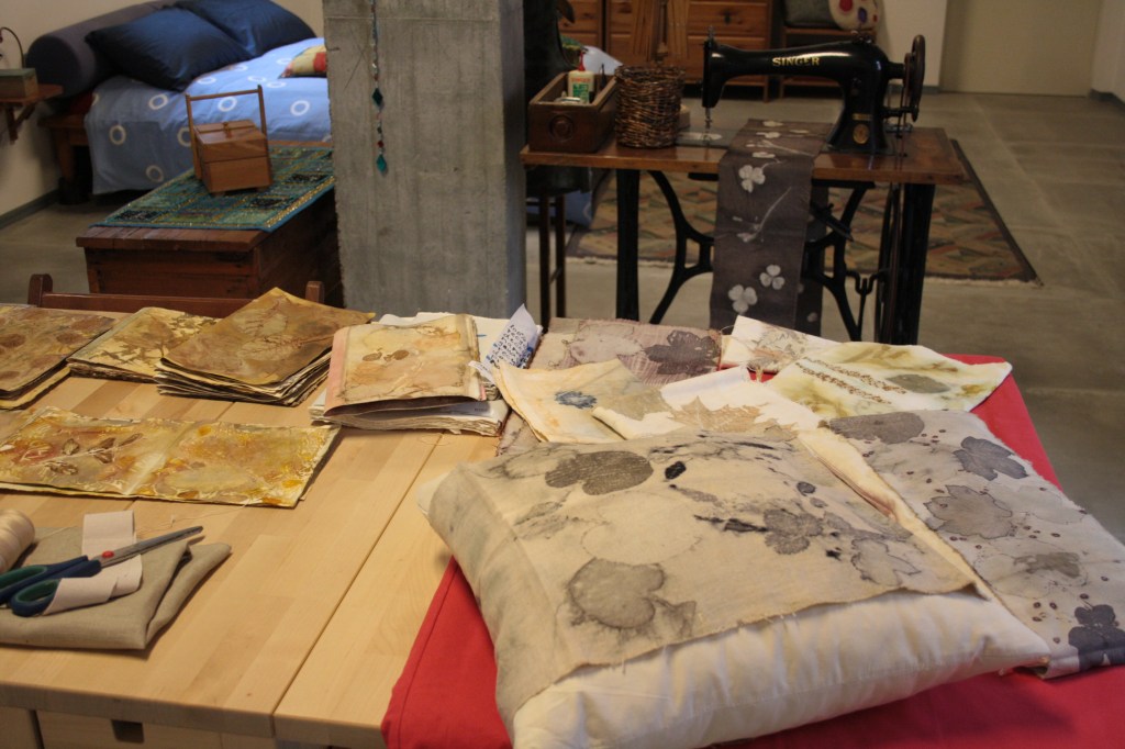 Nell’OFFICINA ogni angolo parla di un progetto, di una sperimentazione in corso: le foglie pronte per essere conservate, la ruggine su pezzi di ferro per creare nuovi effetti, la carta, i tessuti e filati, file di barattoli con etichetta, erbari e campionature, pentole e vaporiere, tubi e legni, corde e stracci. È una grande fortuna poter disporre di uno spazio dedicato alla propria passione che fa dimenticare e superare le limitazioni, che predispone l’animo al fluire della creatività in un vortice di fili, foglie, forbici e vapore. Mentre metto a mordenzare pezze di lana già sto pensando alla raccolta delle foglie cadute di liquidambar che rosseggiano sull’albero del vicino, un invito a creare stelle che cadono su stole e mantelle. Nel packaging dei prodotti non manca il tocco ecoprint, così nascono buste dagli scarti di carta forno con impronte leggere, piccole card che raccontano la storia di ogni lavoro, biglietti, quaderni, piccole borse in carta con applicazioni ecoprint. Le tante campionature messe da parte per anni diventano copricuscini o runner per la tavola… “non si butta via niente…” dice, la mia maestra e compagna di avventura, Michela Pasini, in arte Rosso di Robbia. Dal 2012 non abbiamo più smesso di praticare ecoprint, con dedizione, amore e un atteggiamento etico-ecologico che non prevede l’utilizzo di plastiche, mordenti di sintesi, rimanendo fedeli all’impostazione originale diffusa da India Flint.
