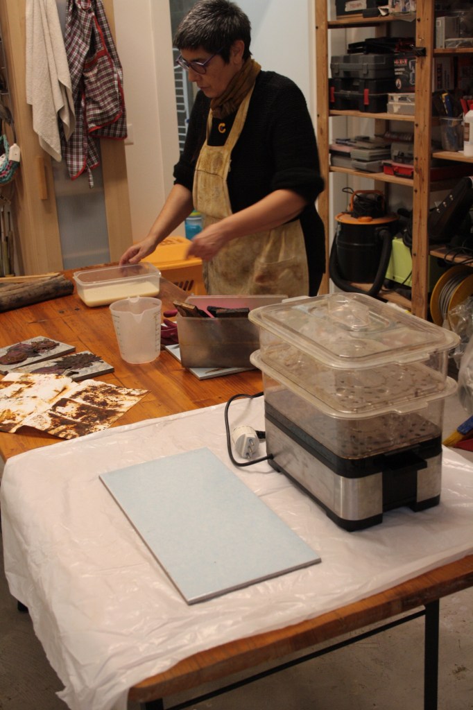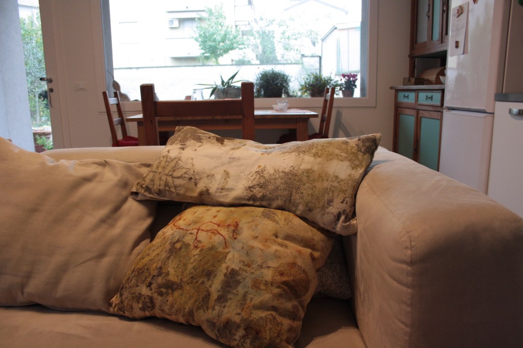 La creatività come strumento di cura da sempre mi ha accompagnato nella vita lavorativa e ora nella vita, non meno attiva, da pensionata. Al centro della mia vita c’è la cura di sé, come base, per rendersi disponibili all’incontro con l’altro, per trasmettere e acquisire conoscenze. Una deformazione professionale che mi ha portato in più occasioni ad allestire laboratori di ogni genere dalla ceramica al feltro. Il percorso non poteva che ricominciare da questa OFFICINA e dalla passione per la tinte naturali. Sei anni fa ho conosciuto Michela Pasini, con lei è cominciata un’intensa amicizia e la pratica quasi quotidiana dell’ecoprinting.