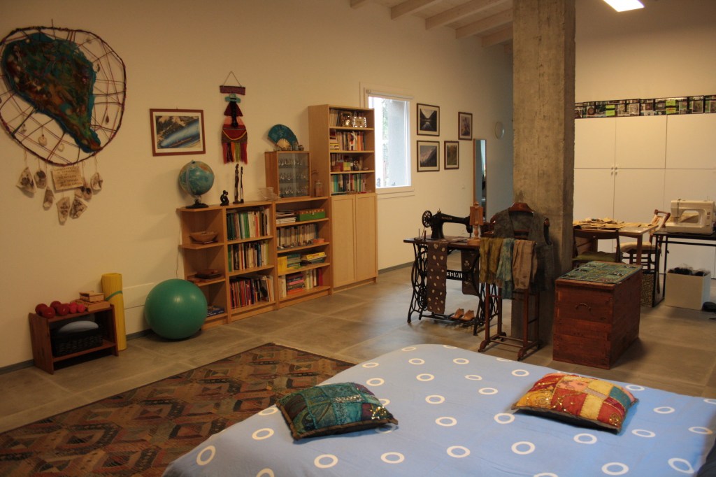 Ogni angolo della casa è vissuto in modo completo senza sprechi di energia e di spazio. La grande stufa centrale scalda la casa ben isolata e dotata di ampie finestre. Il laboratorio è collegato con un cortile interno attrezzato per lavorare anche in esterno. La parte abitativa è dotata di uno spazio studio dove creare, con ago filo, macchina da cucire ecc., ed è collegata ad un ampio giardino che avrà a primavera un orto tintorio-medicinale e diverse piante adatte per sperimentare con la tecnica dell’ecoprint.
