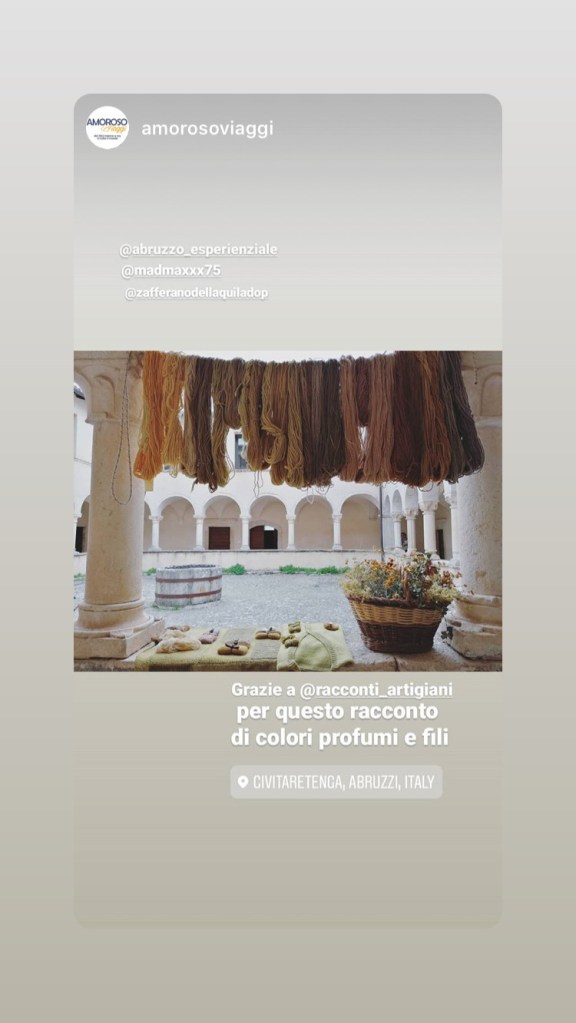 POST SCRIPTUM: la prima occasione per utilizzare le mie matasse colorate è capitata in una bella domenica di luglio. In collaborazione con il Consorzio per la tutela dello zafferano dell’Aquila DOP, Maura Amoroso ha organizzato un bel gruppo per una giornata all’insegna della storia, della gastronomia e del colore. Gli stimmi di crocus sativus – lo zafferano – sono stati i protagonisti indiscussi del pranzo, a cura della Cooperativa Altopiano di Navelli. Le antere (i fili gialli) e gli scarti del fiore di un’esperienza decisamente colorata.