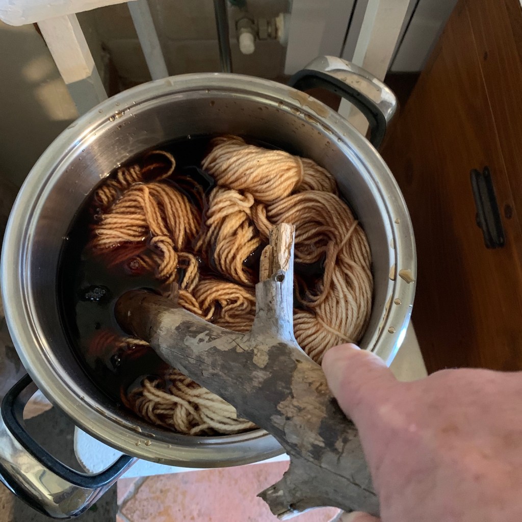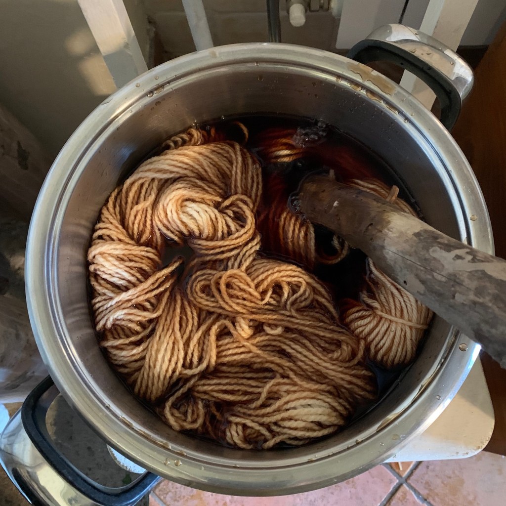 Il segreto, in queste operazioni, è non lasciarsi prendere dalla fretta. Così lascio in ammollo la lana a freddo. Me ne dimentico. Quando la riprendo in esame ha già preso una bella tonalità di colore. La metto sul fornello, a fuoco basso, e la lascio sul fuoco per un’ora circa. La tolgo dal fuoco e me ne dimentico per la seconda volta.