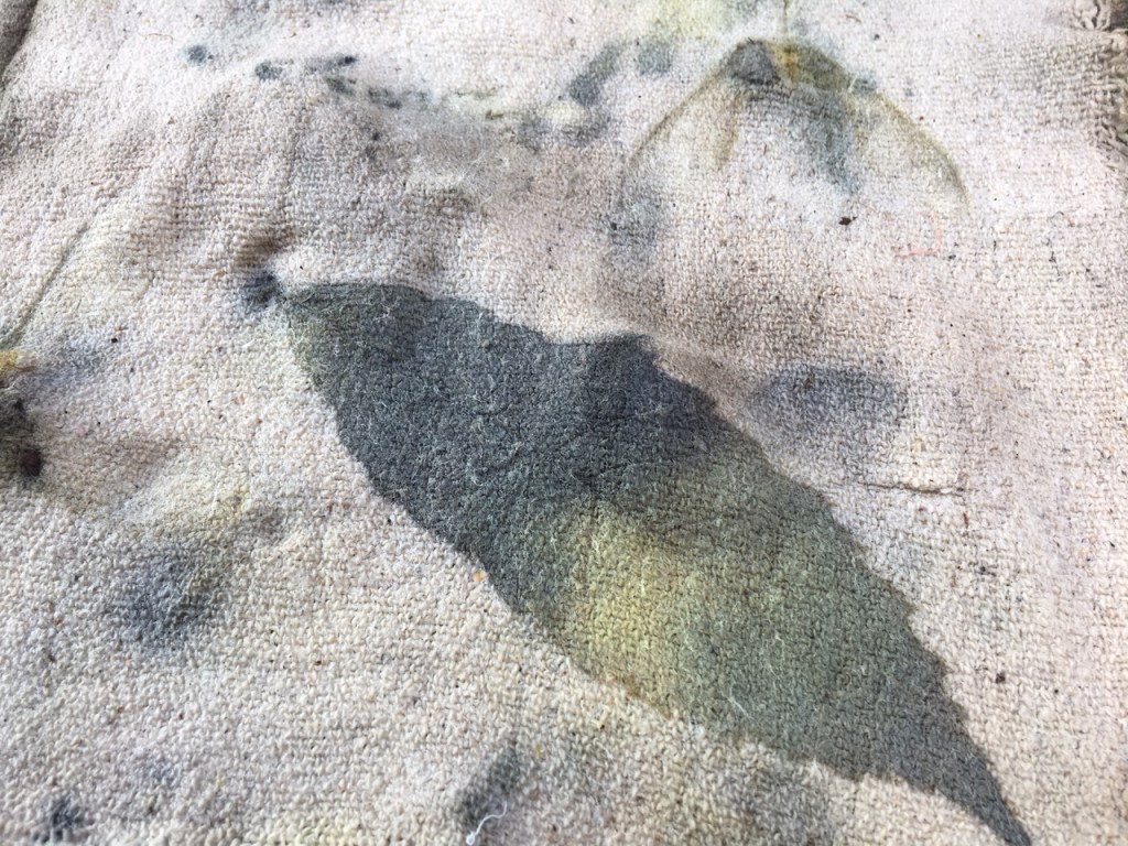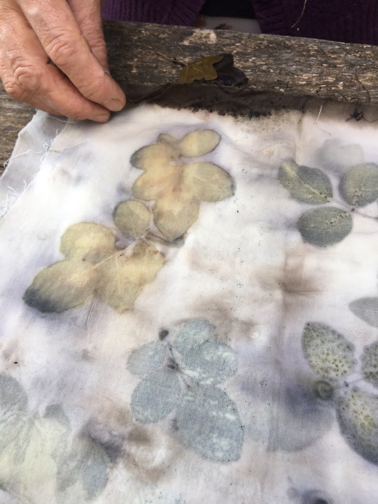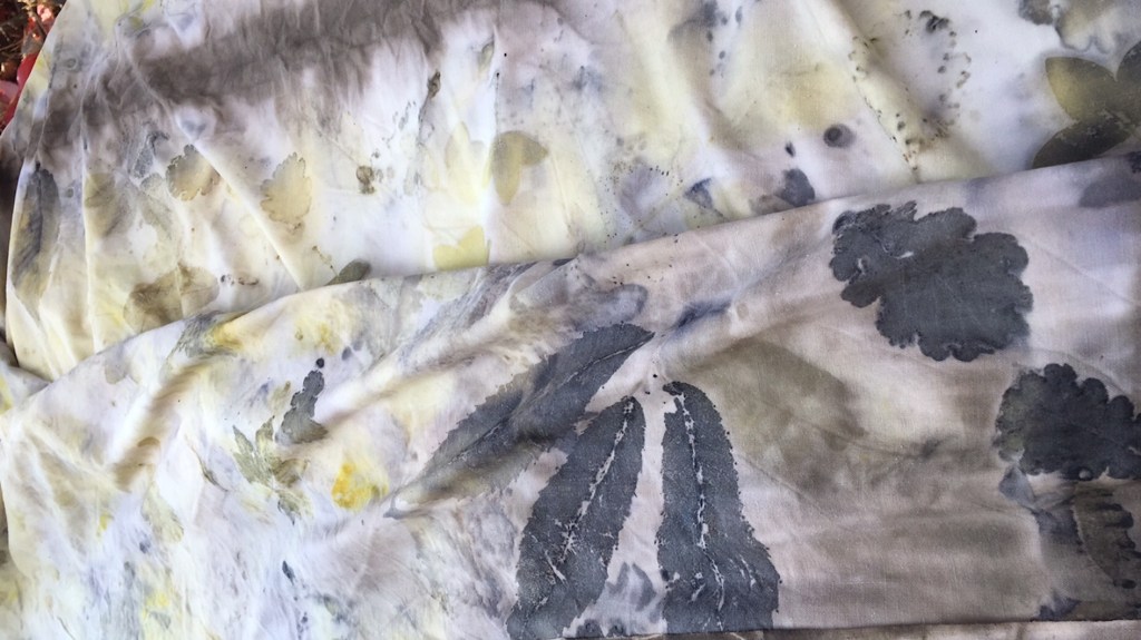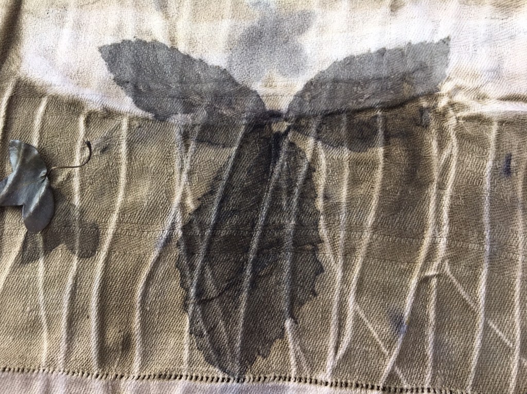 Una volta pronti i tessuti con la mordenzatura ferrosa, viene il momento di disporre il materiale vegetale sui tessuti, di arrotolarli sui fagotti e di legarli saldamente. Sicuramente le stampe avranno colori scuri. Le foglie che sto usando contengono tannino.