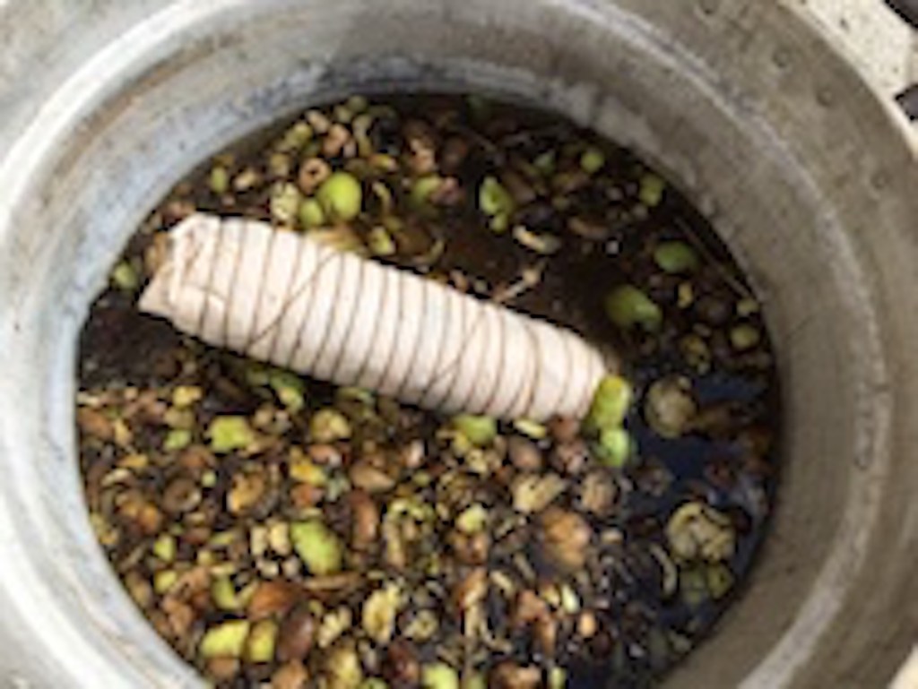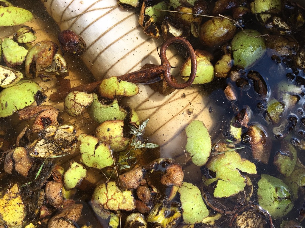 E allora perché non esagerare? Ho conservato i malli delle noci, proprio pensando a un eventuale sperimentazione. Credo sia arrivato il momento di verificarne l’effetto. Così i fagotti finiscono nella pentola insieme al raccolto di malli di noce. A fine cottura, li lascio raffreddare, poi finalmente, li apro per verificare cosa ha prodotto l’alchimia dell’incontro tessuti, foglie, bagni di mordenzatura e colore.