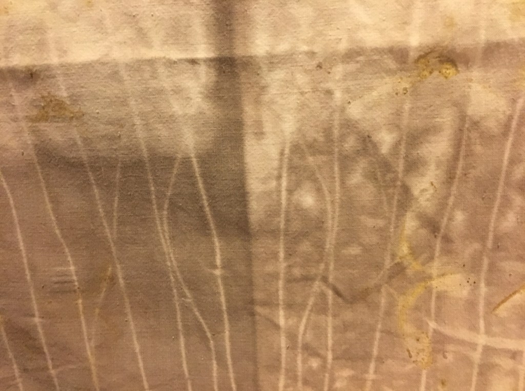 Nella composizione di tessuti ormai asciutti e piegati, è riconoscibile un ‘estraneo’: una striscia di juta che avevo aggiunto nella pentola, giusto per provare in che modo risponde al bagno di colore il tipico tessuto da sacco e da giardino.