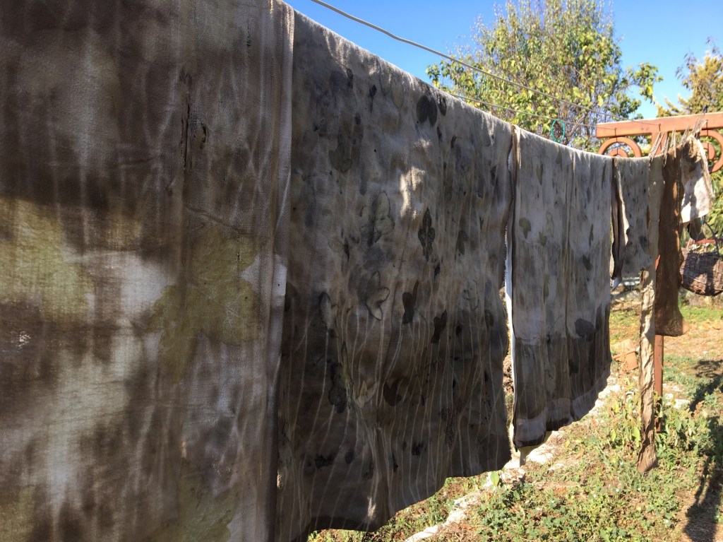 La stesa di tessuti appesa in giardino ad asciugare è il risultato di questa sperimentazione.