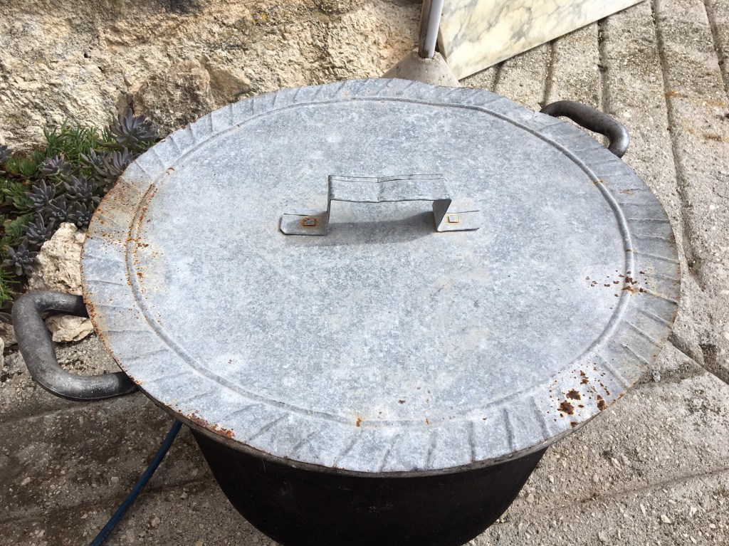 Ho poi scelto alcuni rami della misura giusta rispetto al pentolone che ho a disposizione (completato da un vecchio coperchio di recupero che deve essere appartenuto a una pentola di alluminio) da utilizzare come supporto per i fagotti.