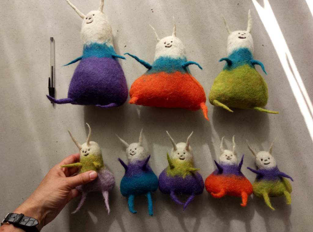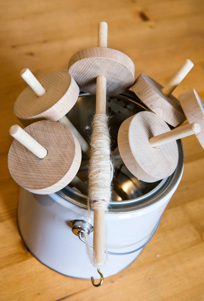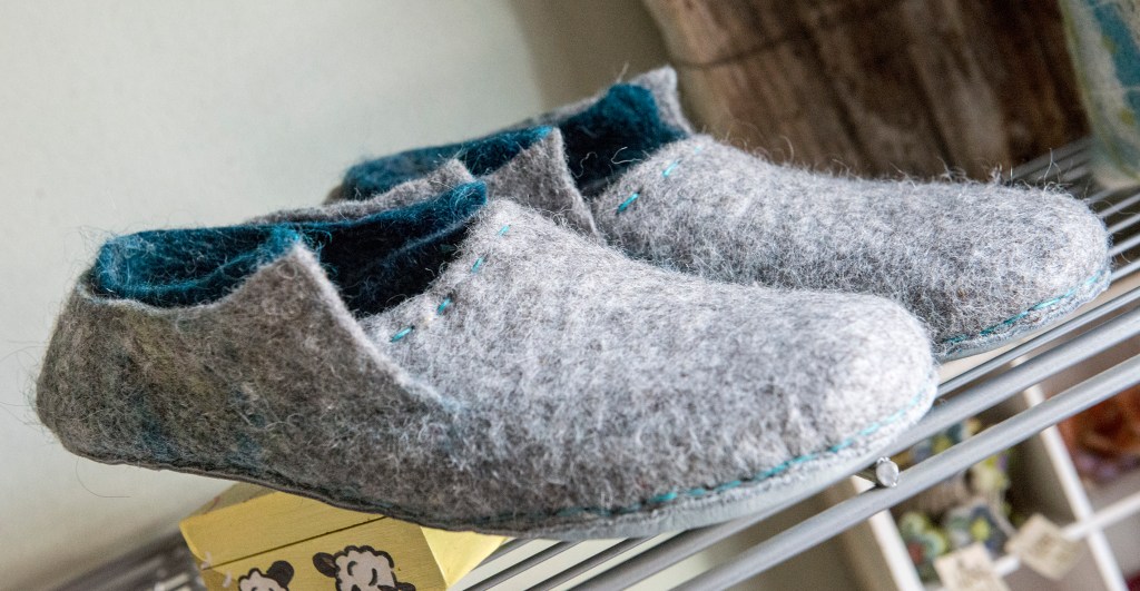 La sua esperienza di taglio e cucito l’ha portata a trattare il feltro come un tessuto, creando i modelli e cucendo tutti i manufatti a mano con resistente filo di canapa. Mentre racconta, si mette all’arcolaio per una dimostrazione di filatura con l’arcolaio della lana delle pecore appenniniche.