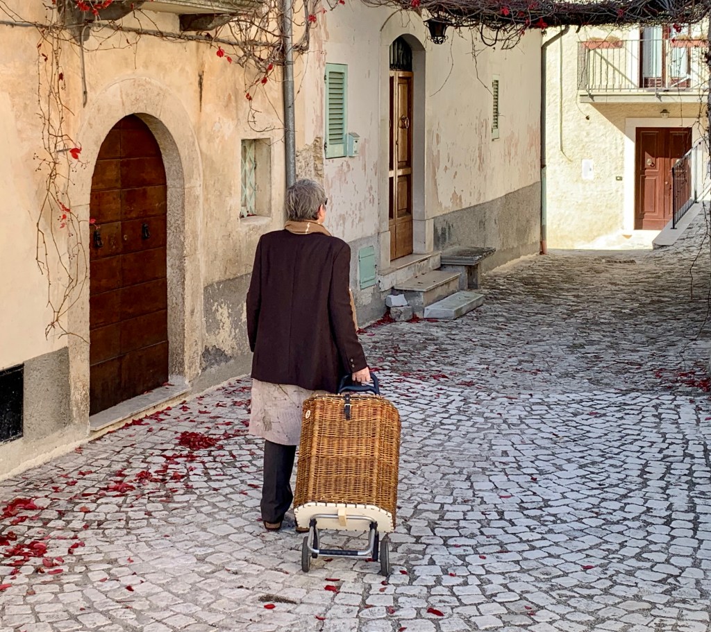 Perché non rimane qui? Perché un paese arroccato su un colle, dove le strade sono, in realtà, scale, è perfetto per i cesti con il manico, non per le ruote! Il carrello ci aspetterà, pazientemente.