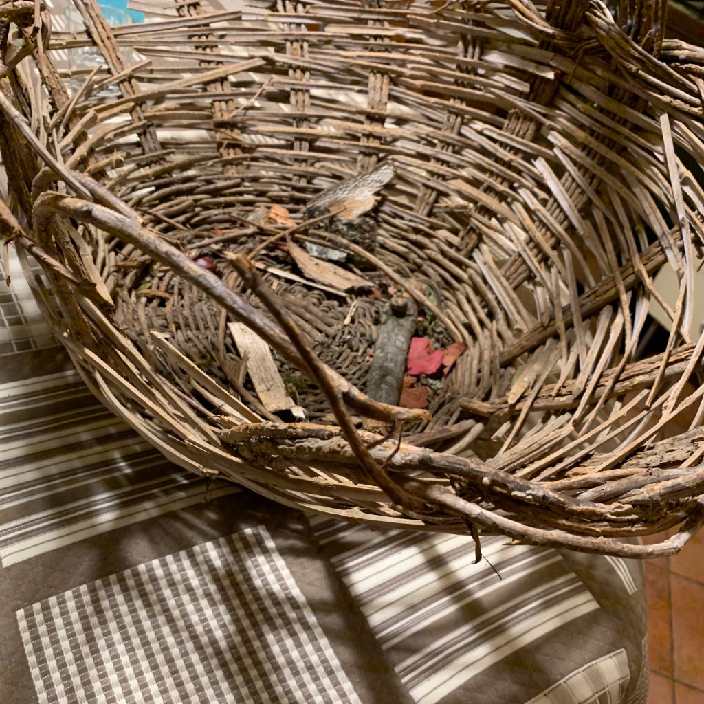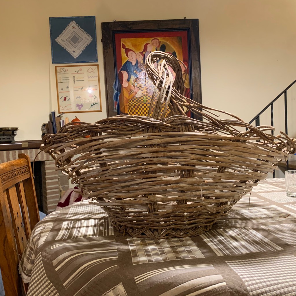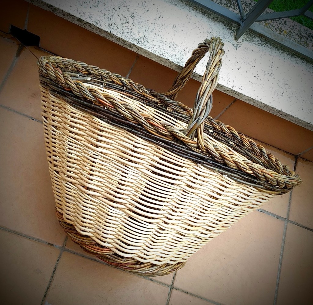 La spiegazione di questa tenace affezione è presto spiegata: il cesto in questione è la parte tangibile dell’eredità per me più preziosa, ossia la memoria della campagna dei nonni e di tutte le cose che ho imparato nei mesi che vi trascorrevo. Non so chi lo abbia realizzato ma credo sia opera di un taglialegna / guardaboschi che veniva regolarmente a svolgere i lavori in campagna (al quale è legata la memoria di una magnifica casetta di ginestra dove io, fratelli e cugini abbiamo giocato per anni! Un manufatto basico, di quelli fatti con ciò che si ha a disposizione in quel momento (getti di nocciolo o di ulivo o anche strisce di canna). L’ho sempre tenuto, pur abitando in città e disponendo al massimo di un balcone. Lo abbiamo utilizzato come contenitore per cose diverse e, quando abbiamo abbandonato la città per un piccolo paese dell’Abruzzo montano, è venuto con noi, ritrovando la sua funzione originaria.