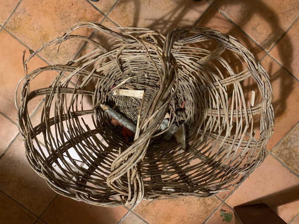 Alla fine delle due giornate, ci siamo trovati con due cataste di legna (abbastanza) organizzate e senza cesto, ridotto a uno scheletro. Ma anche così, passerà del tempo prima che mi decida a usarlo per l’ultima volta, per alimentare il camino!