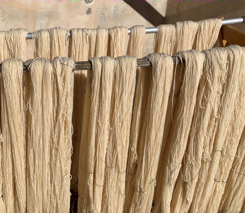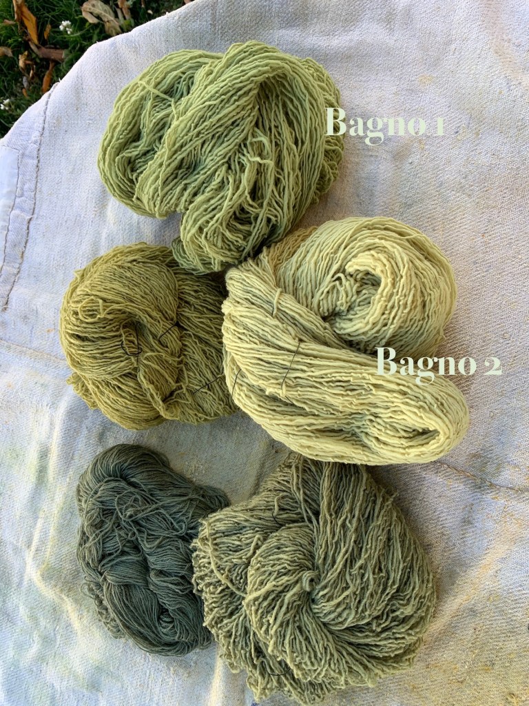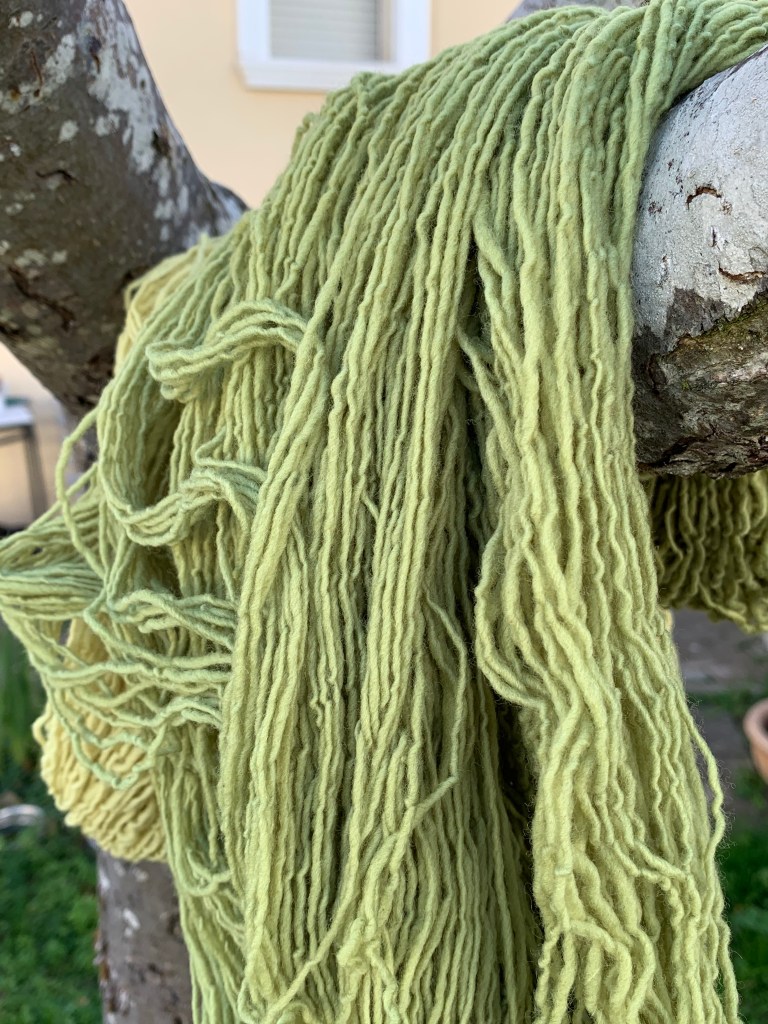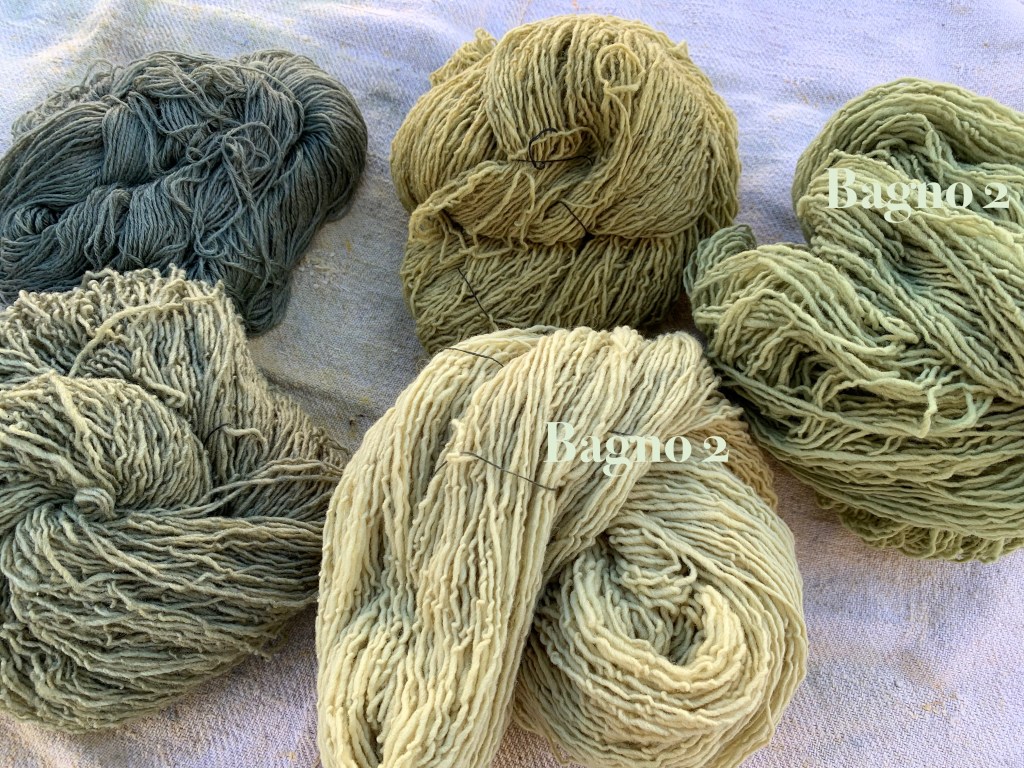 Non solo, il materiale da tingere – la lana – è locale. Proviene infatti dalle greggi che pascolano tra Barisciano e Campo Imperatore e tutto il processo di lavorazione, dalla tosatura alla matassa, è controllato direttamente da Valeria. In termini globali, è poco. In termini di consapevolezza, di lavoro sul territorio, di promozione di processi sostenibili, di crescita delle attività locali, è moltissimo. Ogni piccola azione si va ad aggiungere alle altre, Ciascuna di per sè vale pochissimo. Tutte insieme possono contribuire a salvare l’ambiente. Esattamente come un solo fiore, impalpabile, non vale niente. Insieme a centinaia e centinaia di altri, tinge matasse su matasse di lana. E tutte le matasse che entrano in un bagno, saranno della stessa sfumatura di verde. Le matasse del bagno successivo, saranno di una sfumatura diversa.