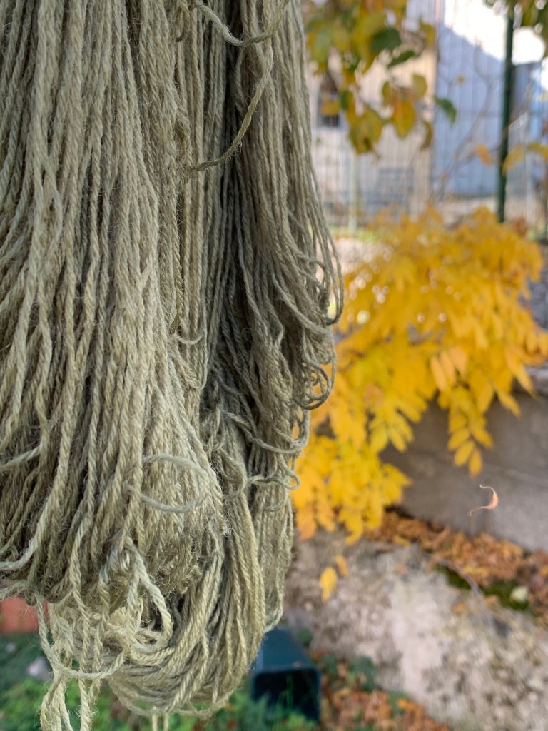Mentre sul tavolo si formano i mucchietti di zafferano, nei cestini ritornano gli scarti. Da quest’anno gli scarti, invece di finire in un angolo dove ben presto si macerano con l’azione del sole e della rugiada della notte, sono diventati prezioso materiale di tintura per la lana AquiLANA di Valeria: Massimiliano ne ha ricevuto in consegna un bel quantitativo per procedere alla tintura, dopo una serie di esperimenti iniziali. Come entusiasta promotore della cooperativa di comunità Oro Rosso ha avviato questa attività prendendo i contatti con Valeria e organizzando il lavoro, nel cortile che è diventato il fulcro del lavoro, tra pentole, pentoloni, secchi e secchielli. Naturalmente non poteva che essere il cortile di Agnese e Gianfranco!