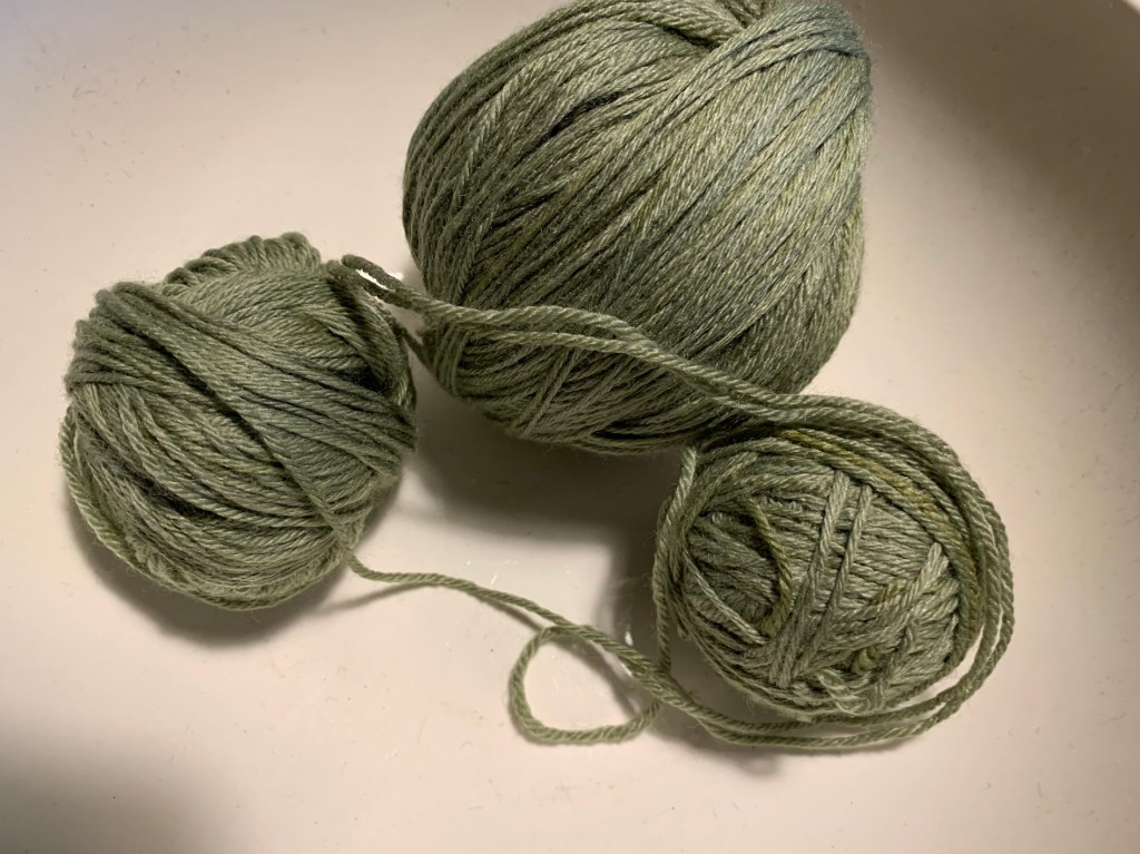 Una volta lasciata alle spalle la stagione, le matasse asciutte, divise nei vari bagni di colore, in altrettante sfumature di verde, consegnate a Valeria o alla sede della cooperativa, recupero un campione di ogni bagno per realizzare qualche semplice lavorazione, una sorta di promemoria per l’anno prossimo.