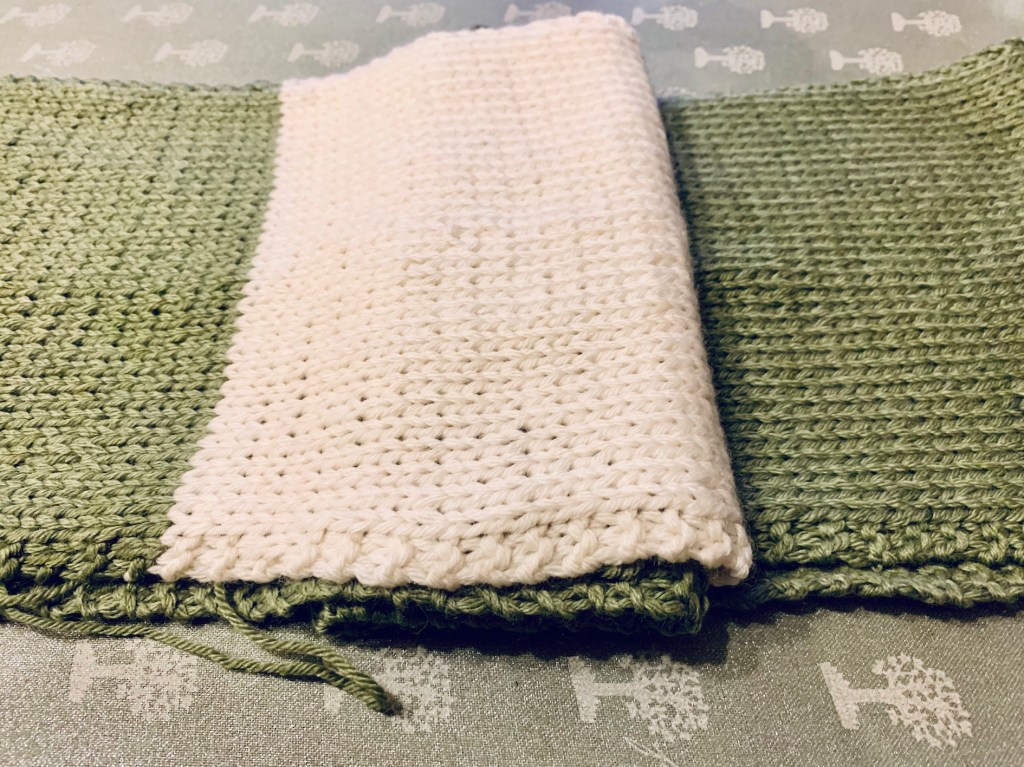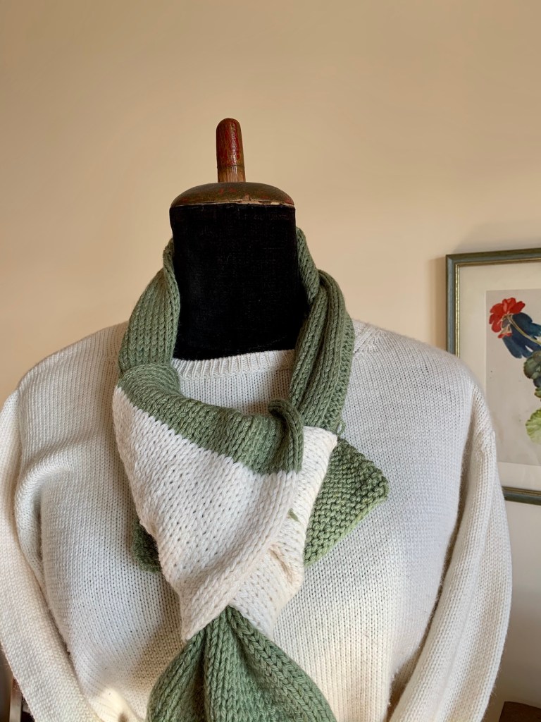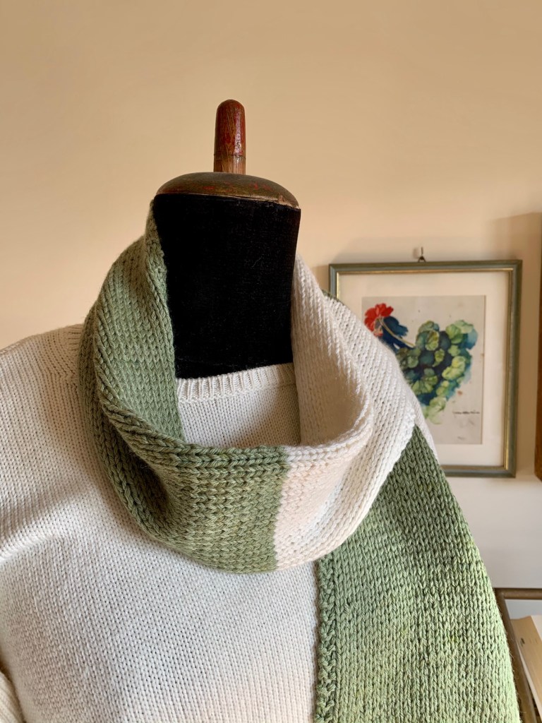 Una matassa verde e un gomitolino del colore originale, sono sufficienti appena per una sciarpa, di dimensioni ridotte. Difficilmente abbinabile ad altro che non sia il maglione lavorato con lo stesso filato. Ed è così che lo immortalo, insieme al maglione, sul vecchio manichino da sarta, ricordo della mia seconda mamma, di tutti gli abiti che ha realizzato, lavorando indefessamente per tutta la vita e di quando, ormai cinquanta anni fa, l’aiutavo a mettere i ‘punti lenti’, sui tessuti pronti per l’imbastitura.