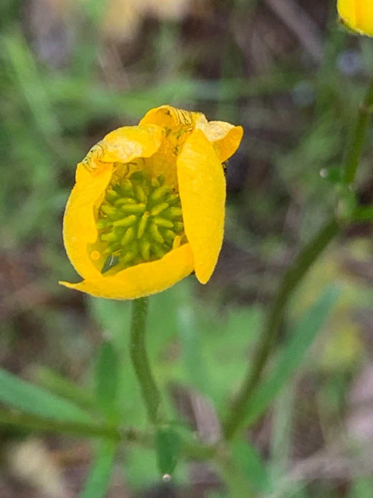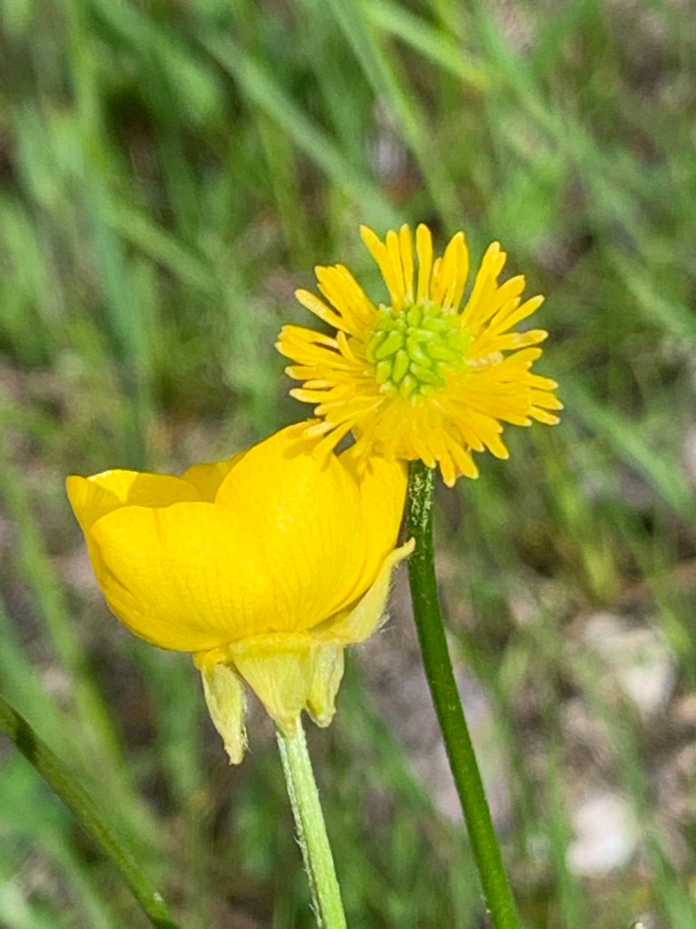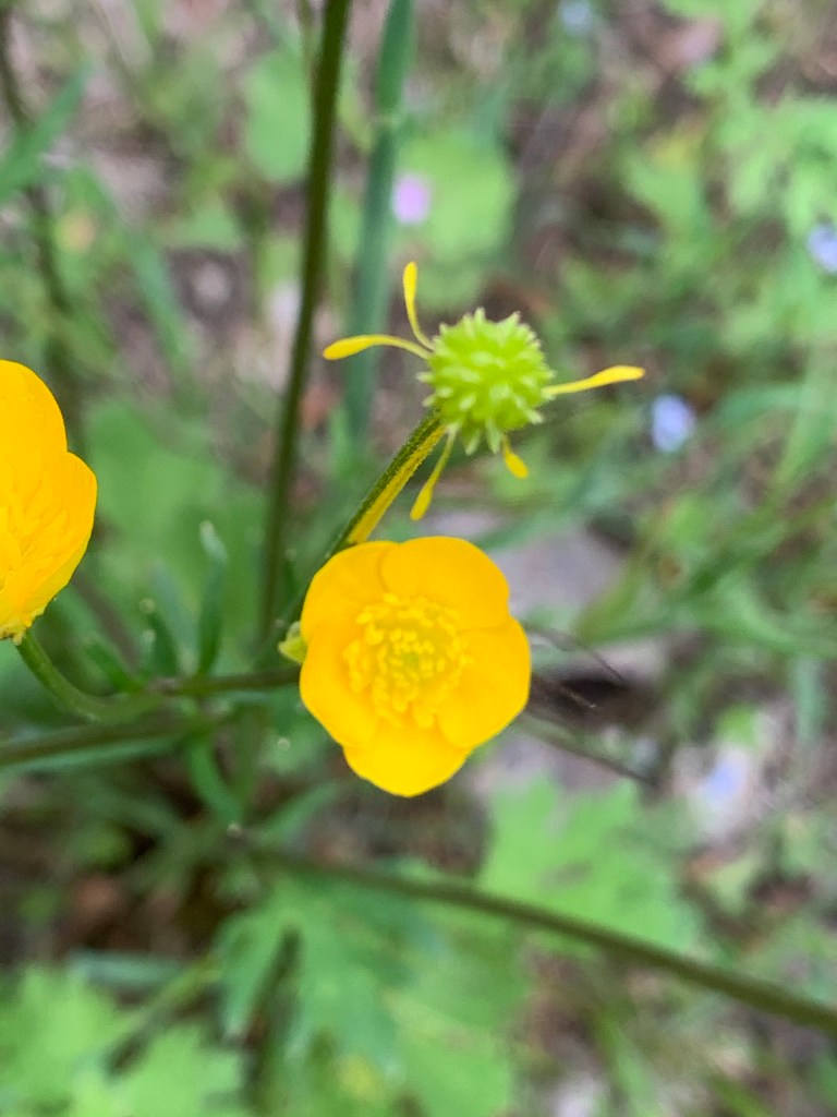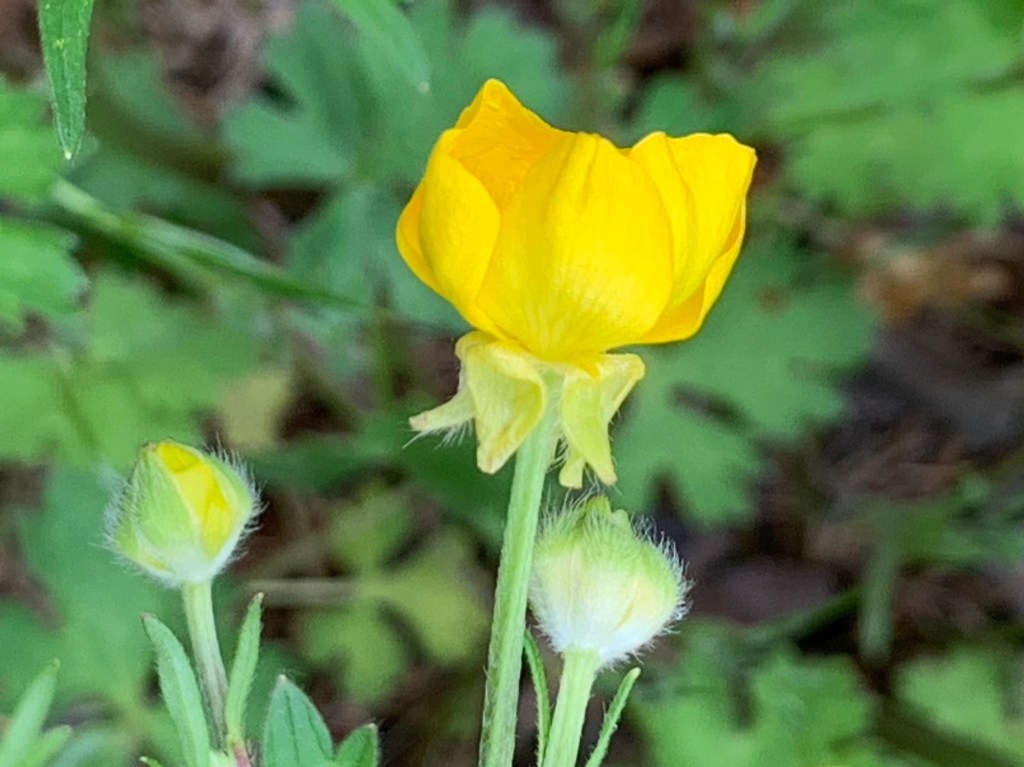In questo angolo, dove gli anni passati si vedeva, tra le altre erbe, qualche sparuto capolino giallo di botton d’oro (trollius europaeus, dall’antico tedesco troll, globo, per la caratteristica forma a palloncino del fiore prima di schiudersi), qualche giorno fa abbiamo scoperto un prato verde completamente disseminato di caratteristici bottoncini gialli, proprio nella zona più umida e riparata. Ogni fiorellino a uno stadio diverso: ancora in boccio, semiaperto, completamente in fiore o già sfiorito.
