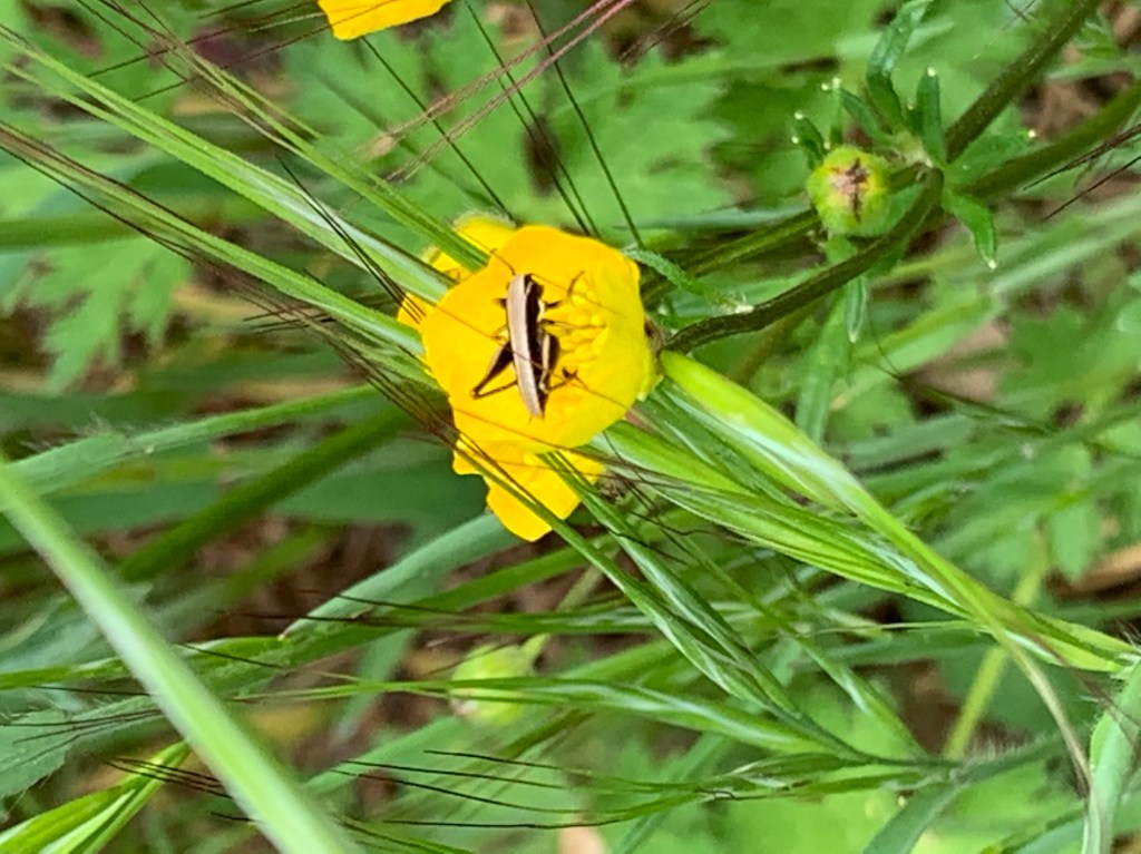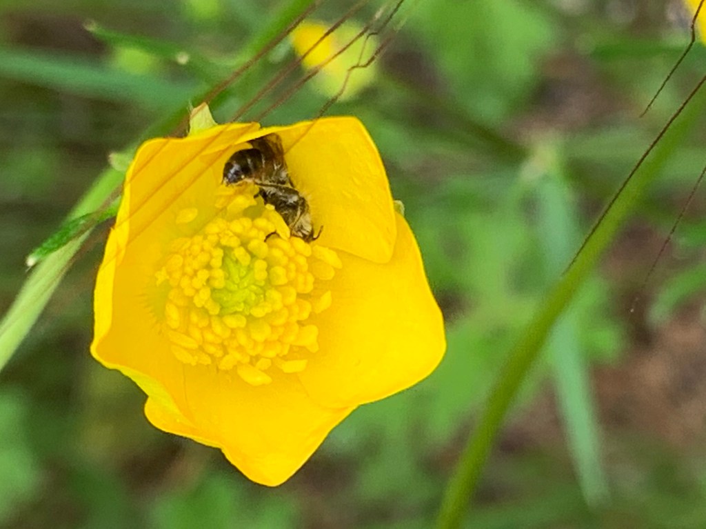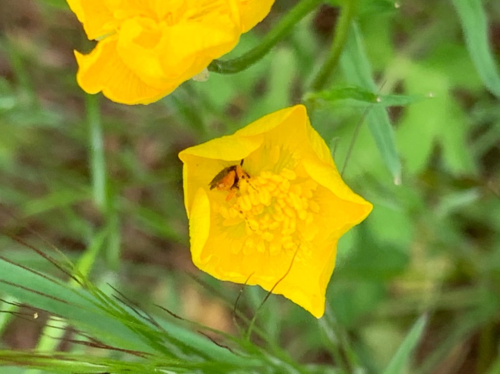 I ranuncoli, generalmente noti con il nome di botton d’oro (trollblume, globeflowers, boule d’or) sono una pianta velenosa in tutte le sue parti. Gli animali erbivori se ne tengono a debita distanza. Mentre li passo in rassegna, scopro il secondo effetto collaterale. Un incredibile affollamento di insetti diversi, piccoli, medi e grandi. Sono tutti acquattati, accovacciati, rintanati nelle corolle dei fiori, molti completamente ricoperti di polline. Alcuni sono così grandi che sono ospitati a stento all’interno della corolla che rimane ‘impassibile’ e ben dritta nonostante il peso. Con una sola eccezione: la corolla dove si è annidata o, almeno, dove ha cercato di annidarsi una fastidiosa cimice ‘aliena’ che trasborda pericolosamente.