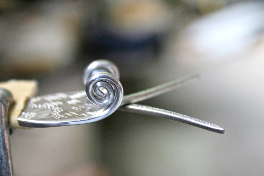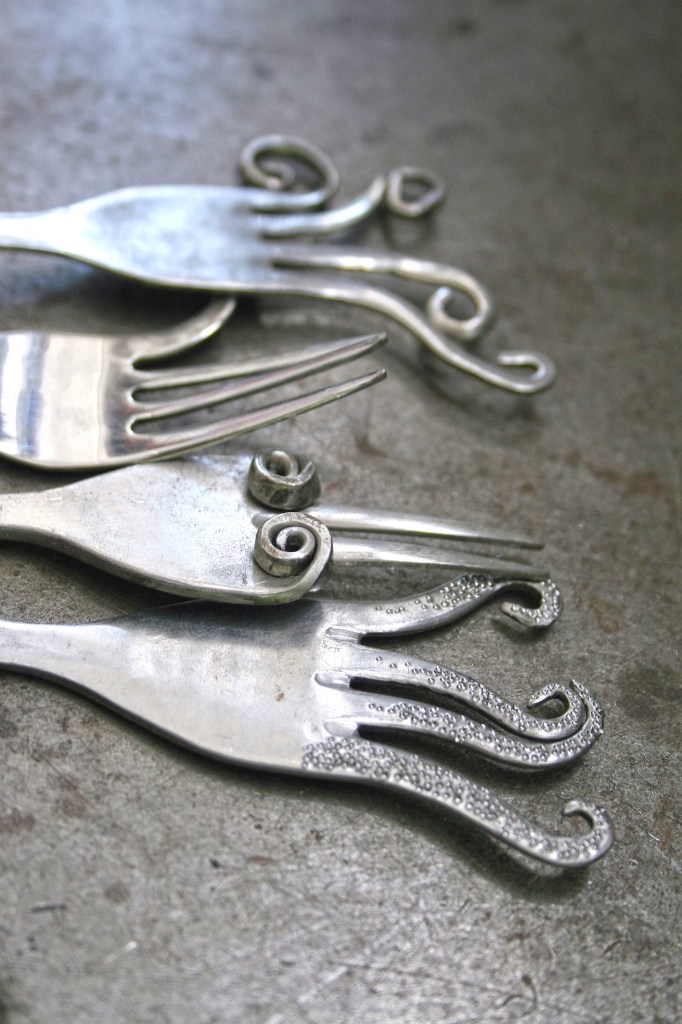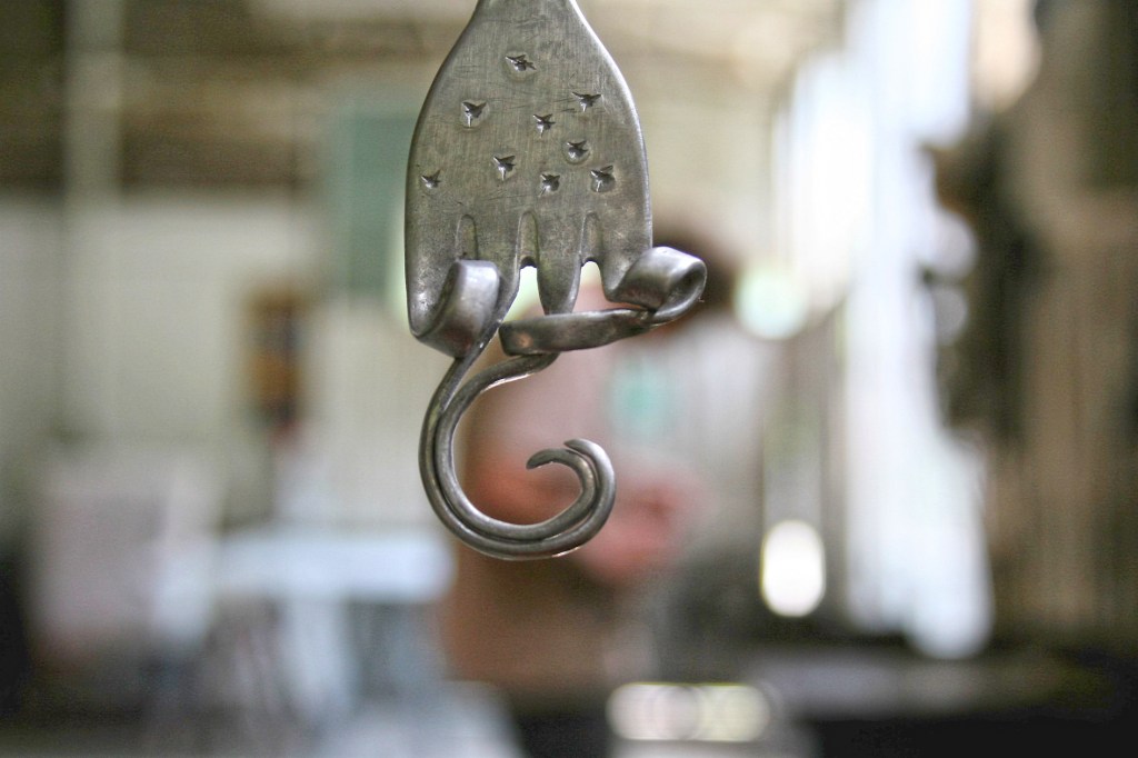Quest’uomo, infatti, ha ascoltato il mio suggerimento e ha lavorato quella prima forchetta storcendola e arricciandola, fino a ricavarne un ciondolo stupendo. Trasformare quella posata gli è piaciuto talmente tanto che è andato avanti a storcerne altre, poi si è buttato su cucchiai e cucchiaini.