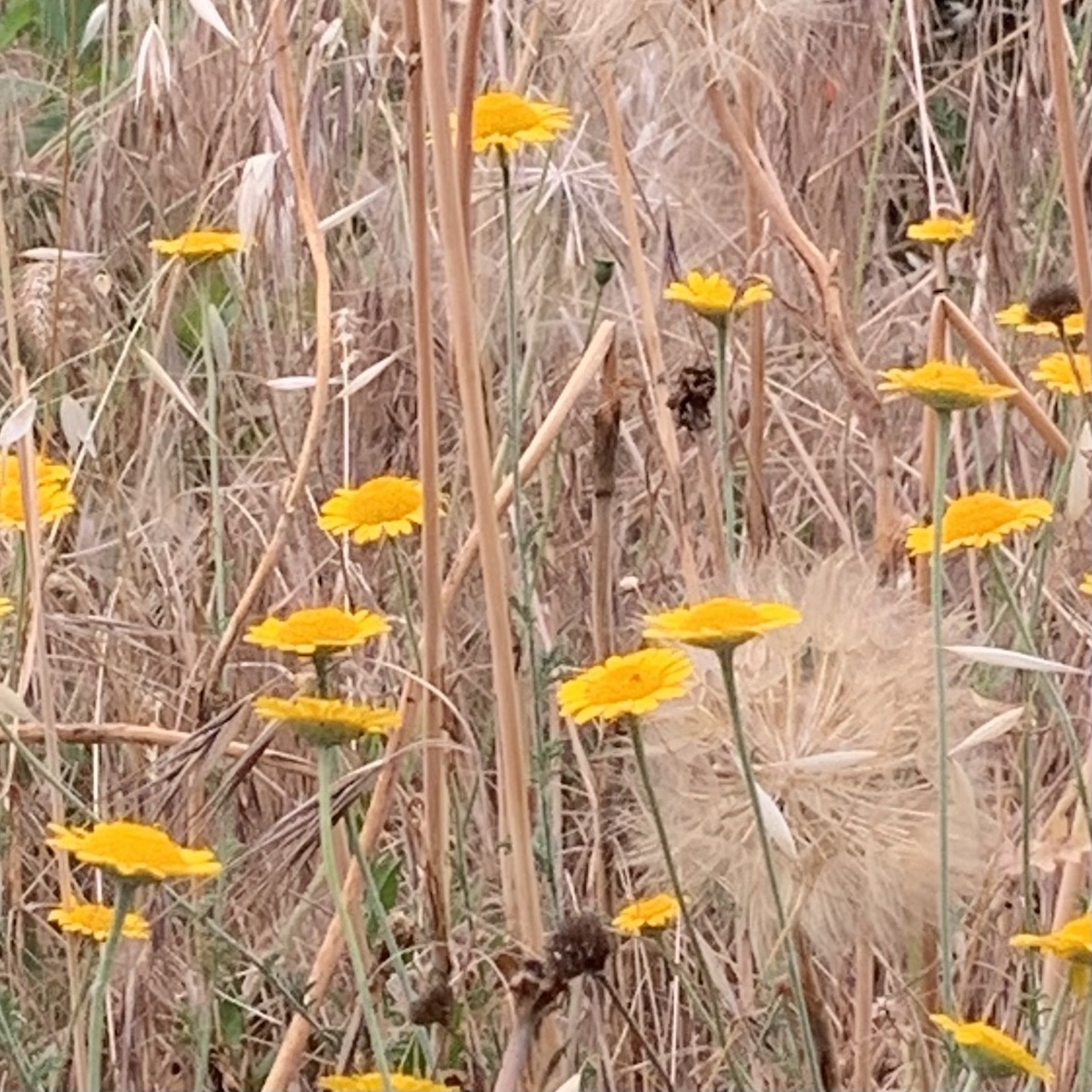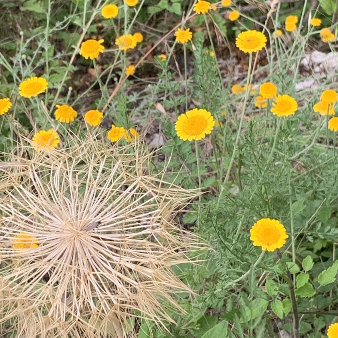 Palloncini leggerissimi, isolati e svolazzanti … nel bel mezzo di una distesa di un’altra asteracea, la camomilla dei tintori (Cota tinctoria) preziosa per chi ama la tintura vegetale.