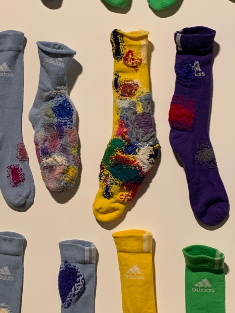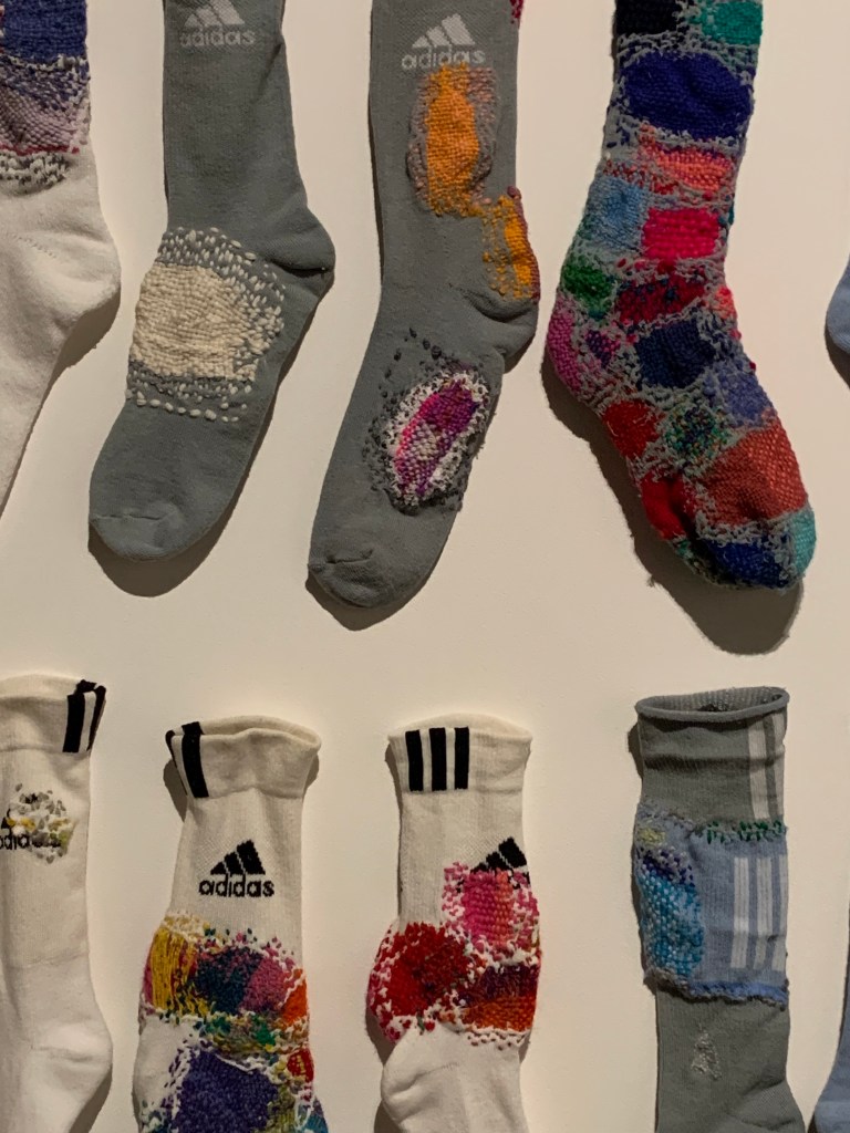 A meno che non capiti di trovarsi davanti a un’installazione artistica a base di calzini rattoppati, frutto di un lavoro paziente, dai tempi lunghi, recuperato da consuetudini desuete.