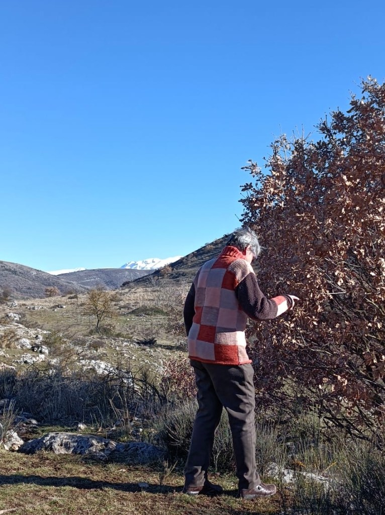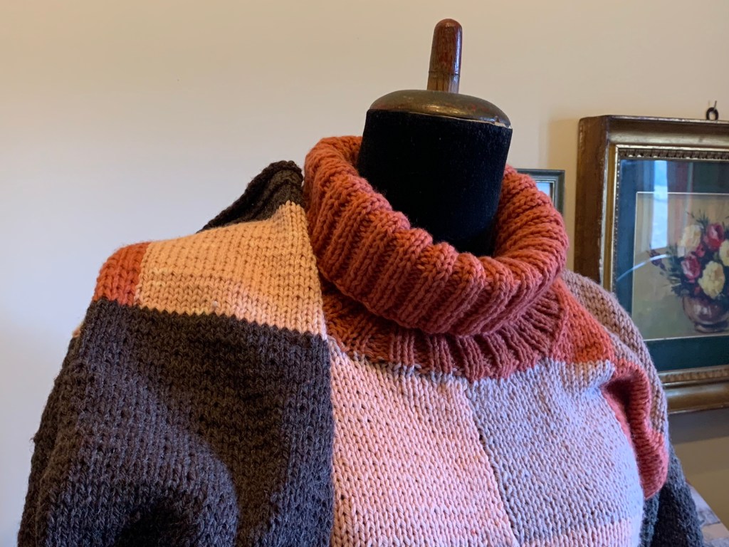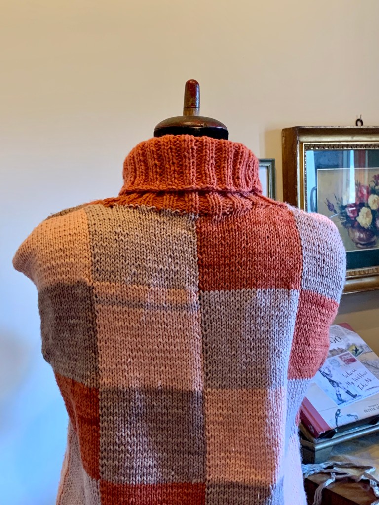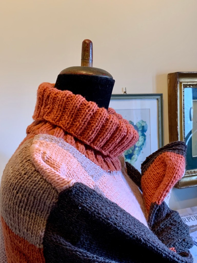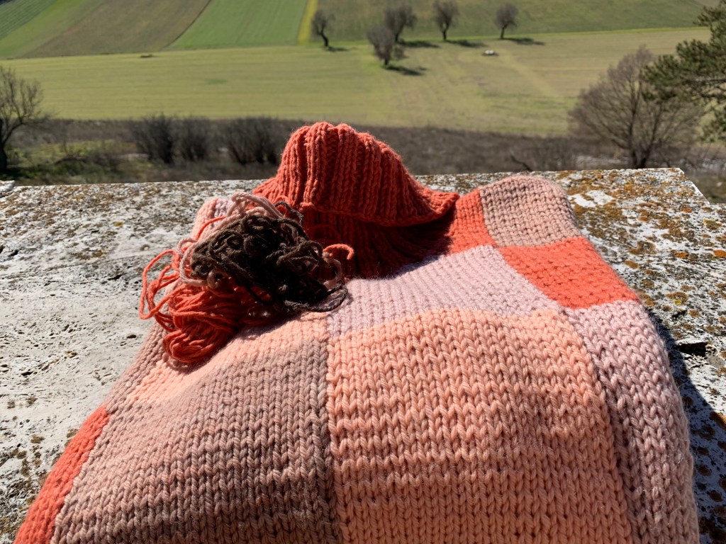 Gli avanzi non erano sufficienti per completare il maglione. Ho risolto lavorando le maniche con la lana marrone naturale delle pecore nere che ho trovato nella bottega dell’Azienda Zootecnica Gran Sasso di Giulio Petronio a Castel Del Monte (dalla quale non esco mai senza qualche matassa).
