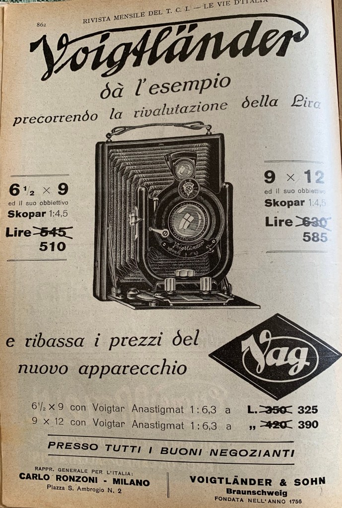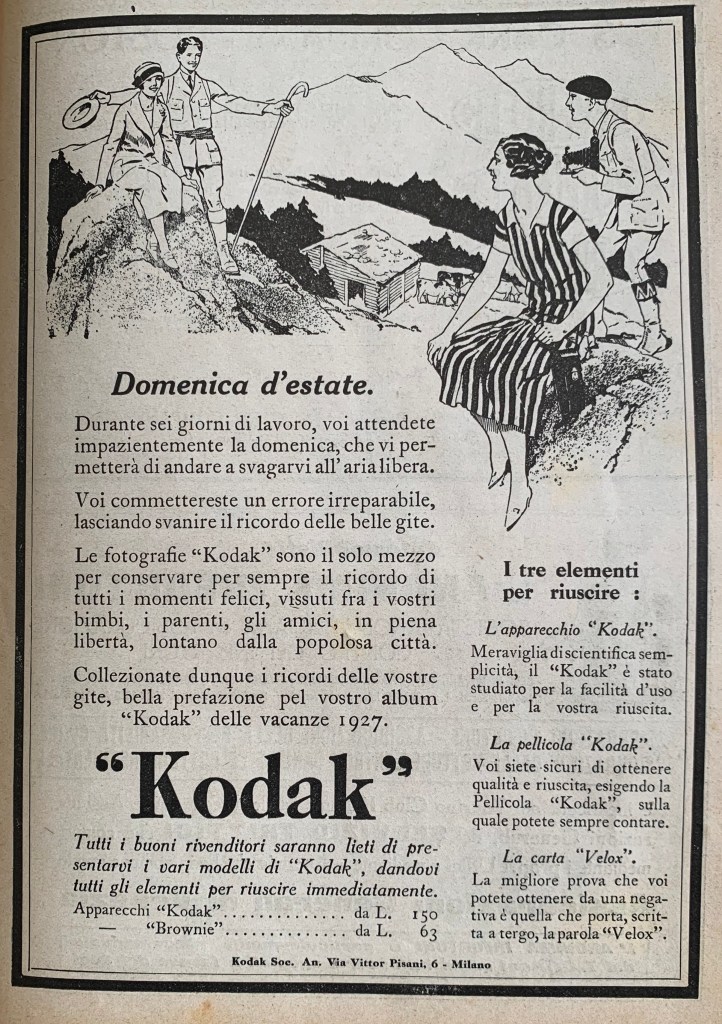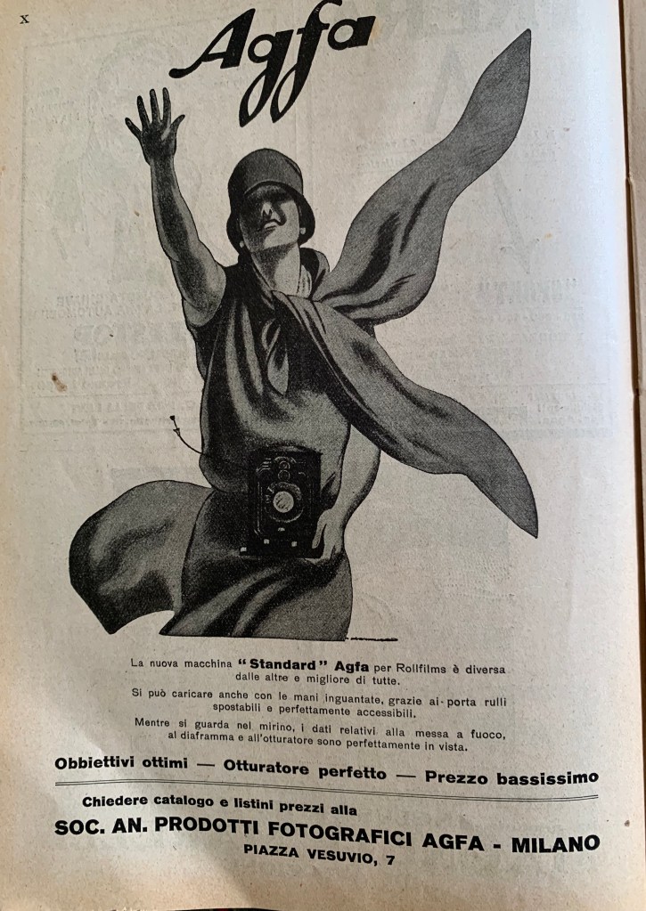 Le pubblicità delle macchine fotografiche d’epoca sono ricavate da vecchi numeri di Le Vie d’Italia, il mensile del Touring Club Italiano di cui posseggo alcune copie, salvate dalla casa dei nonni.
