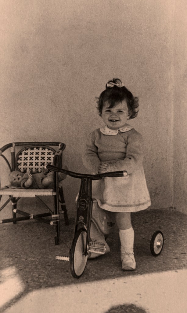 A volte i ricordi tornano a galla con la complicità di fotografie d’altri tempi, un po’ sbiadite, in bianco e nero. Anch’esse reperti, così come le immagini che hanno immortalato e che riemergono nella memoria. Tra queste, una mi ritrae, bambina, in una carrozzina di inizio anni Cinquanta, nell’ampio terrazzo della casa di città dei nonni materni. Un’altra, già più grandicella, su un triciclo decisamente essenziale.