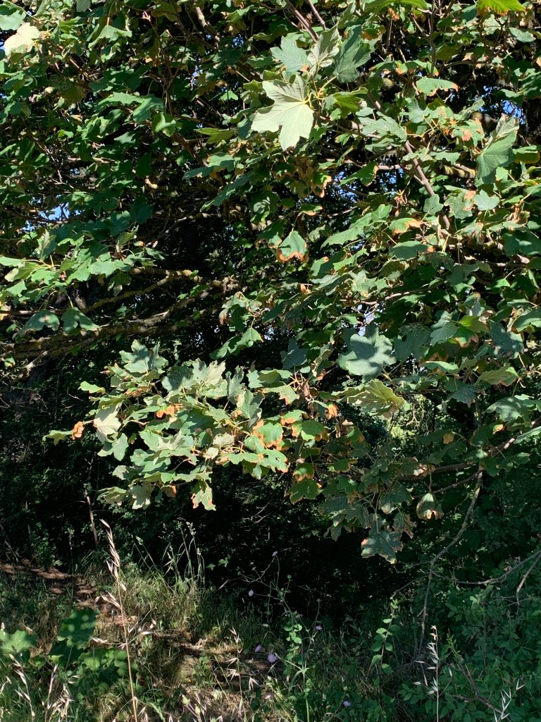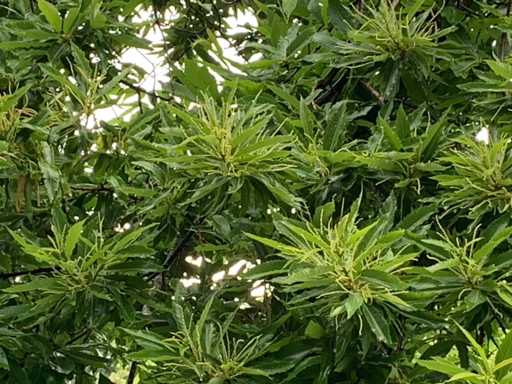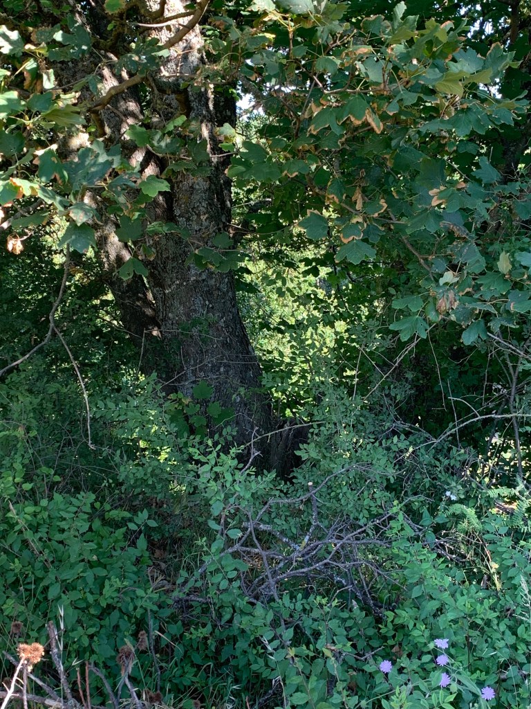 Lo inseguiamo osservando il tripudio della fioritura dei castagni, le nocciole già in pieno sviluppo tra le foglie dei rari noccioli e cercando di riconoscere, qua e là, di quale specie sia l’acero che, da intruso, svetta ai margini di castagni e faggi.
