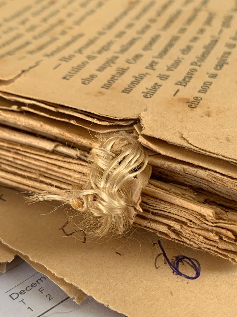 Più difficile, meglio, impossibile ricostruire la storia di questa copia, scompaginata ma accuratamente riparata (con ago e filo) per scongiurare – per quanto possibile – la ‘fine’ del libro. Sicuramente non è un libro acquistato in una libreria dell’usato o su una bancarella (cosa che faccio ogni volta che me ne capita l’occasione!).