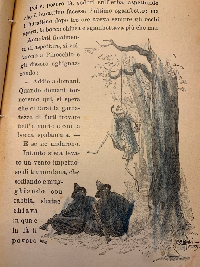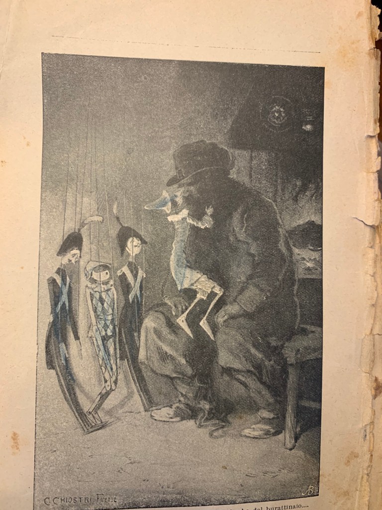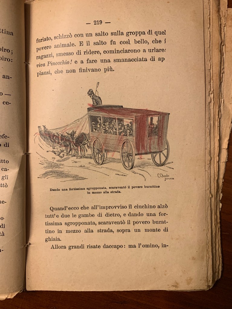 Una veloce ricerca mi fornisce le notizie essenziali: nato a Firenze nel 1863 è stato tra i primi illustratori di Pinocchio. Quindi l’edizione che ho tra le mani, ritrovata casualmente tra i libri accatastati in ordine sparso in uno scaffale dimenticato, è quella della casa editrice Bemporad del 1901.