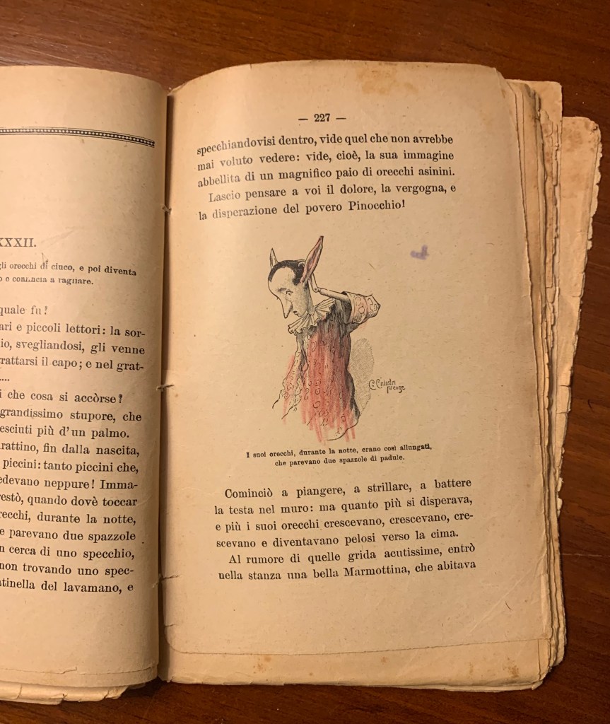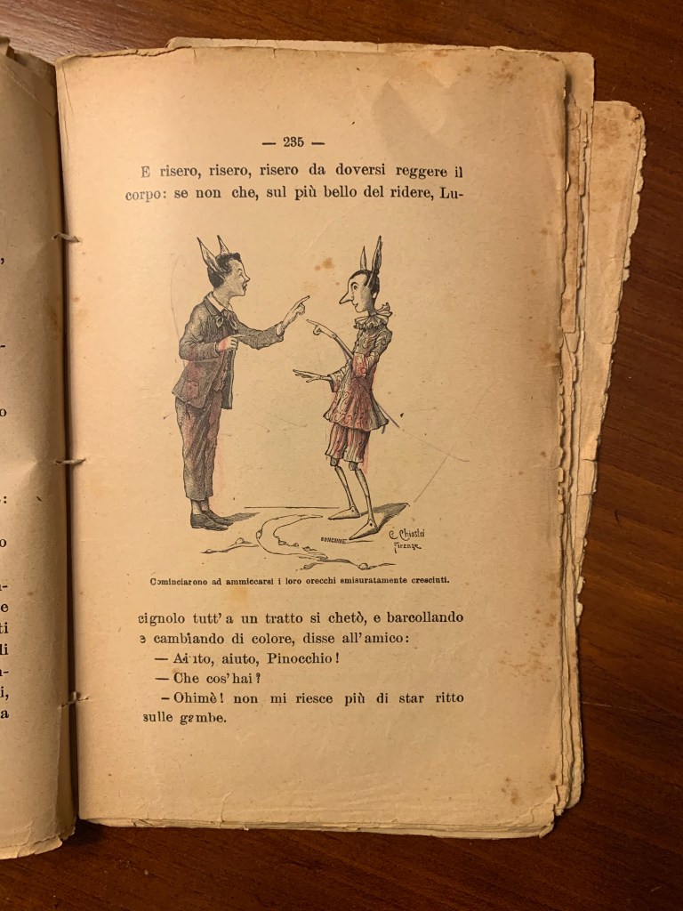 Non è difficile capire di cosa si tratti: basta una rapida scorsa alla prima pagina e all’indice per riconoscere una copia di Pinocchio l’opera sicuramente più nota di Collodi (Carlo Lorenzini, 1826-1890), pubblicato per la prima volta nel 1883.