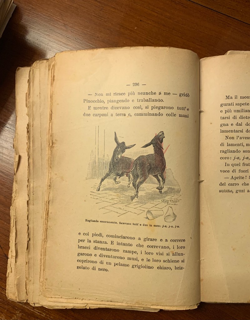 Rileggo i capitoli dal XXX al XXXIV relativi alla disavventura di Pinocchio che non sa resistere al richiamo del Paese dei balocchi, complice l’amico Lucignolo, con la conseguente trasformazione dei due amici in somari (sulla scorta dei miei studi classici e dell’interesse per tutte quelle forme letterarie che suggeriscono origini popolari, dall’epica alla favola, dal mondo greco q quello latino, la raffigurazione dell’asino in letteratura e nelle arti figurative è una delle mie fissazioni!).