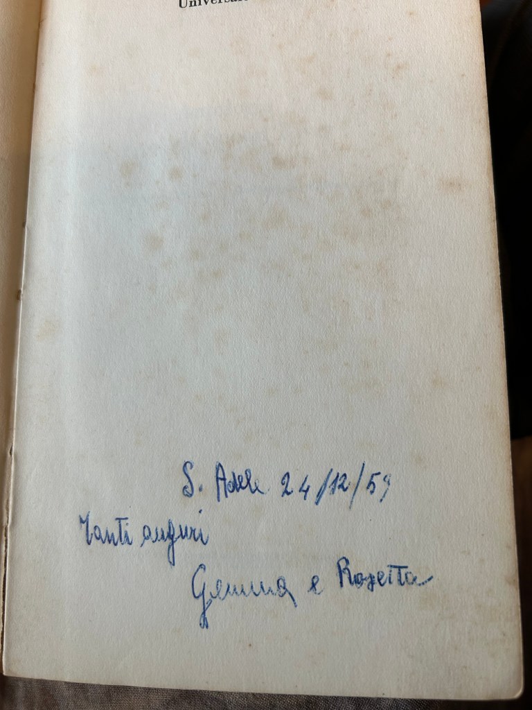 Il caso ha fatto sì che, proprio il giorno prima di ricevere questo inaspettato reperto/ricordo, avessi ripescato tra i libri della nostra disordinatissima biblioteca, una copia di Antologia di Spoon River di Edgar Lee Masters con una dedica preziosa: era il regalo che le sorelle hanno fatto in occasione del suo onomastico a mia zia Adele, nel settembre del 1959. E mia zia, qualche anno dopo me lo ha fatto conoscere, insieme a tanti altri libri (John Steinbeck, Harper Lee, ecc.). Ero ormai adolescente, frequentavo il ginnasio, e la consuetudine con la zia era un’abitudine: mi piaceva stare con i nonni e, per periodi anche piuttosto lunghi, i nonni, gli zii e i loro figli sono stati la mia famiglia allargata (con l’approdo all’Università i vagabondaggi dovuti al lavoro del babbo non facevano più per me).