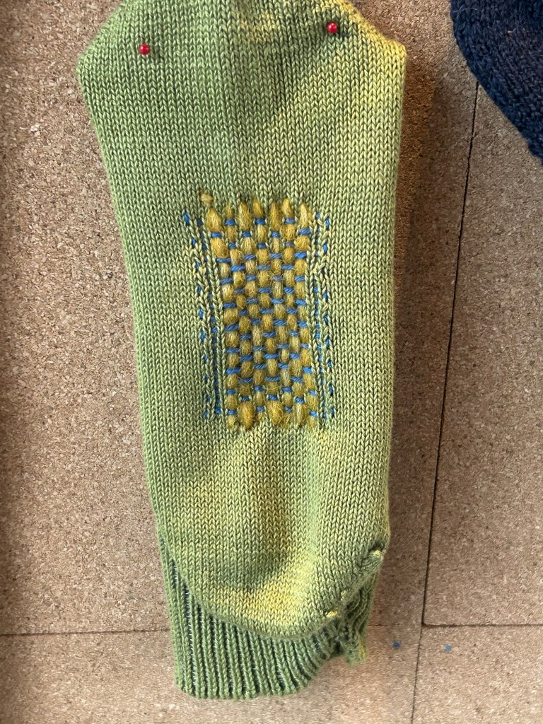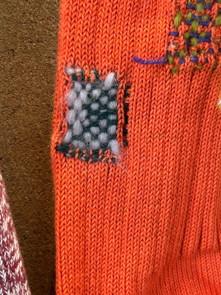 Ed è il risultato del lavoro di Celia Pym, artista tessile che interpreta con ago e filo un capo di vestiario quotidiano, forse anche banale, che si presta ad essere arricchito, riparato, addobbato, rattoppato e riutilizzato, anche quando è tanto usato da essere malridotto da buchi più o meno grandi. E lo fa anche in collaborazione, come nel caso di questa esposizione nata nel corso di numerosi workshops tenuti nel corso del 2024 con gli alunni di una scuola londinese (la Surrey Square Primary School community in Southwark).