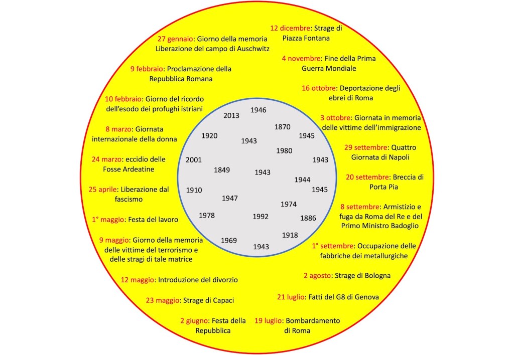 Le 22 date prese in esame coprono un arco di tempo di 164 anni (dal 1849 al 2013), la cui ricorrenza, di mese in mese e di anno in anno, dovrebbe garantire la consapevolezza sociale, civile e politica dei cittadini, nel più ampio quadro delle relazioni diplomatiche con gli altri paesi.